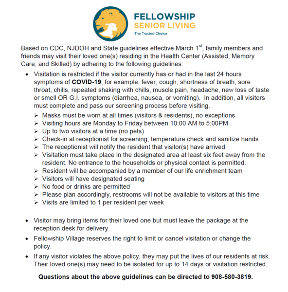 Fellowship Senior Living Established in 1996, we are a faith-based, not-for-profit organization with a strong history of serving seniors in New Jersey. We currently provide outdoor visitation with our Health Care Center residents in accordance with policies & procedures recommended by the NJ Department of Health and the CDC.作品图集