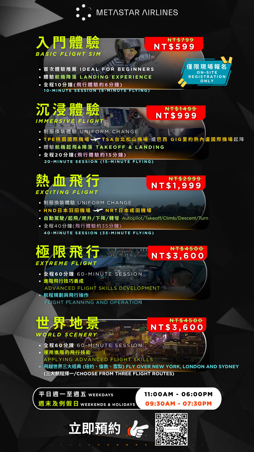 <機型隨機> 於促銷折扣碼欄位填上「平日飛出國」可享$400元折價--------------------------------------------------------------------------------------------在課程開始前,我們將迎接您並提供簡短的中心介紹,包括模擬機的特點和學習環境。此外您亦可選擇合適尺寸的飛行員制服,以提升您的飛行體驗。接著在教官指導下,共同完成一場完整的航程規劃與飛行操作。駕馭於世界知名地景,挑戰及俯瞰都市之美的卓越飛行若