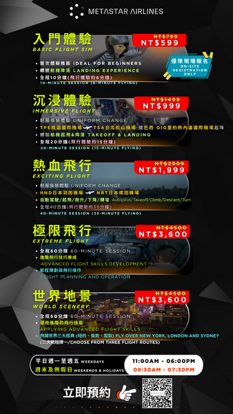 體驗內容 |<機型隨機>教育中心內設有Airbus A320及Boeing B737-800兩種機型。在課程開始前,我們將迎接您並提供簡短的中心介紹,包括模擬機的特點和學習環境。在進入模擬機艙時,我們的專業教練將為您提供詳細的機艙介紹,解釋各種儀表和控制器的功能(大約5分鐘)。您將了解如何操作飛行模擬機以達到預定的目的。接下來就是分鐘的模擬飛行體驗,您將隨著飛行教官進行降落進場操作,這將讓您體驗到穩定降落過程中的刺激和挑戰。※【機型將以現場安排為準,如需指定機型請在訂單備註,同時段同