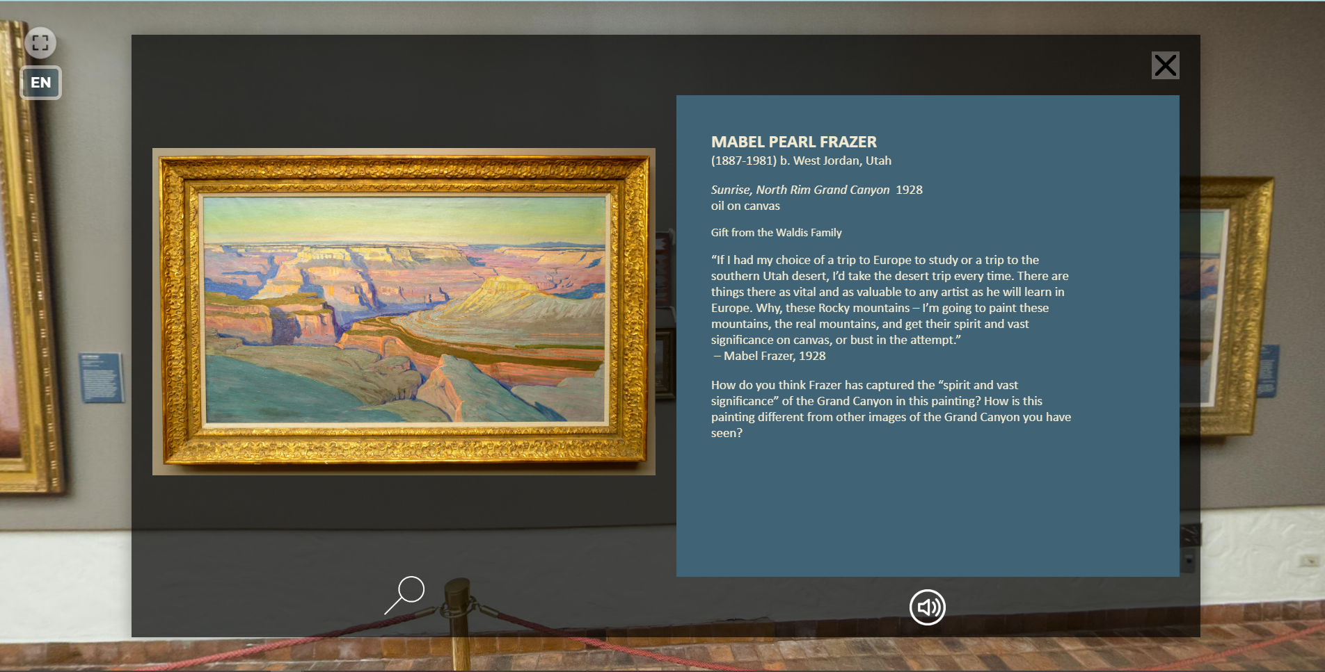 The Springville Museum of Art (SMA) fosters beauty and contemplation through life-affirming art and experience for Utah's Art City and its diverse communities. The Museum encourages our youth to develop into thoughtful individuals and caring human beings. We recognize the seed of potential within each individual, and we seek to nurture growth through the creative process, positive cultural values, an acquaintance with excellence, and a belief in the beauty of life. The Museum offers a variety of educational programs and resources for K-12 educators and students.Virtual Field Trips 1st-12th grade (50-minute time slot)Field trips are between 30-40 minutes These interactive virtual experiences allow visitors and students to navigate the galleries, click on artworks they are interested in, see artworks close up, and read label information. Choose between a self-guided option or book a live Zoom session with one of our Museum docents or educators.作品图集