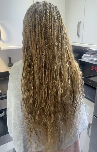 Like Knotless Braids, but with extra flair! ✨ Prices for large parts start at £90 for mid-back length, £100 for booty length, and £110 for thigh length. For medium parts +£10, and for small parts +£20, as smaller partings take more time. I recommend