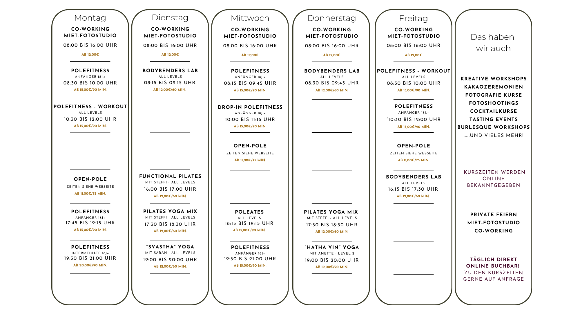 Willkommen bei „NavinaSphere“!Im Herzen von Moosach bietet die „NavinaSphere“ einen Ort, der tagsüber als familiäres Coworking-Space und Mietstudio konzipiert ist und abends in einen vielseitigen Kursraum verwandelt wird. Hier können Sie an einer Vielzahl von Aktivitäten wie Yoga, Klangschalenmeditation, Pole Fitness und Malkursen teilnehmen, oder selbst hosten. Unsere Räumlichkeiten sind darauf ausgerichtet, eine familiäre Atmosphäre zu schaffen, die ideal ist, um neue Fähigkeiten zu erlernen, sich zu entspannen, zu feiern oder einfach nur neue Menschen zu treffen.Mit den flexiblen Buchungszeiten, einer Preisgestaltung nach dem „Family & Friends“-Modell und einer offenen, einladenden Gemeinschaft zielt die „NavinaSphere“ darauf ab, ein zugängliches und einladendes Umfeld für alle Nutzer zu schaffen. Dieses "gemeinnützige" Projekt wurde ins Leben gerufen, um einen Raum zu bieten, der sowohl individuelle als auch gemeinschaftliche Entfaltung ermöglicht und unterstützt. Details zum Studio: Großzügiger Raum: insgesamt ca. 80qm zzgl. kleiner Küche, Garderobe und Toiletten, mit gemütlichem Lounge-Bereich. Küchenausstattung: Kaffeemaschine, 1 mobiler Induktionskochfeld, Gefrierschrank, Kochutensilien nach Absprache Kursausstattung: Yogamatten, Polestangen, bodentiefe Tanzspiegel Vielfältige Papier-Backdrops: Mit einer Größe von 272 cm Breite und 340 cm Höhe, verfügbar in Schwarz, Grau und Weiß. Technik: 4K Beamer & 150" LeinwandDiscounts & coupons