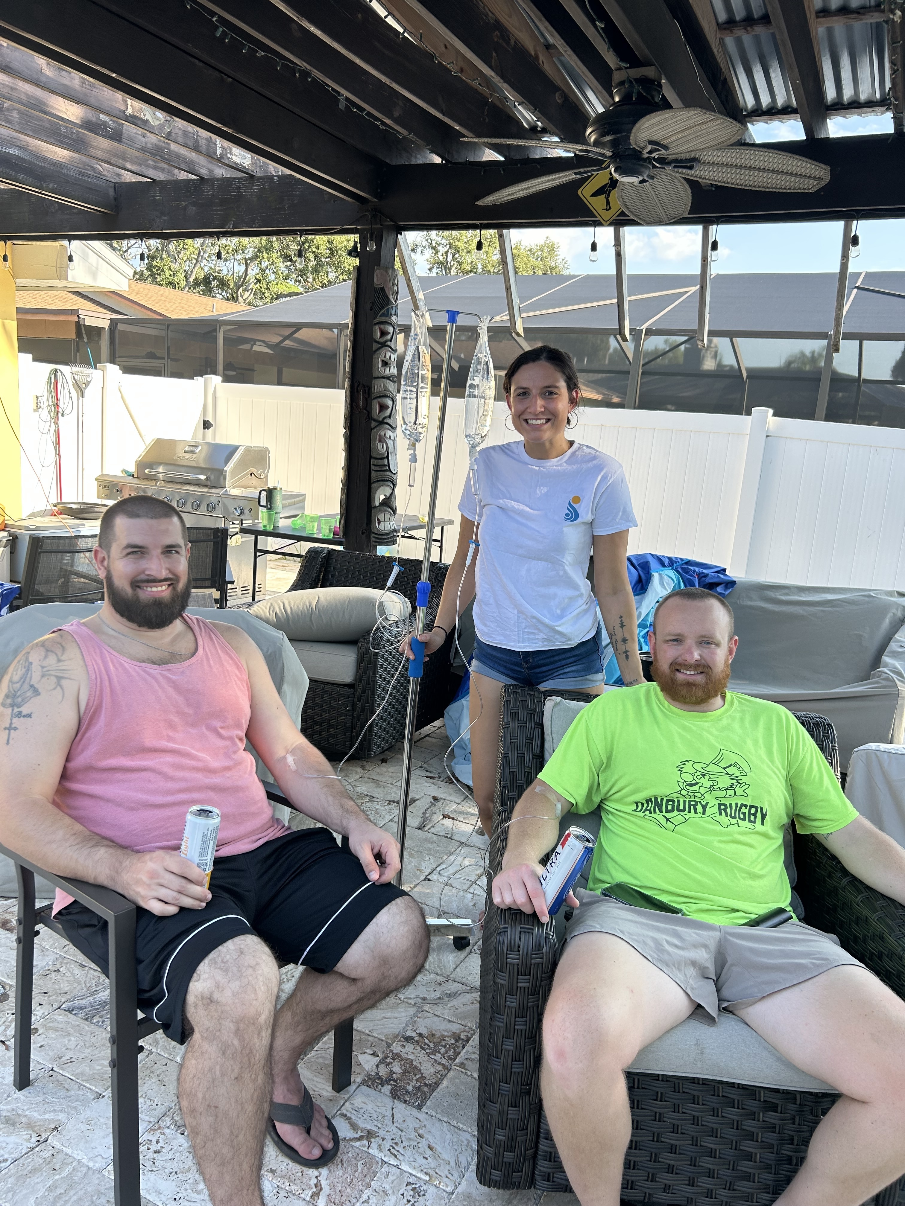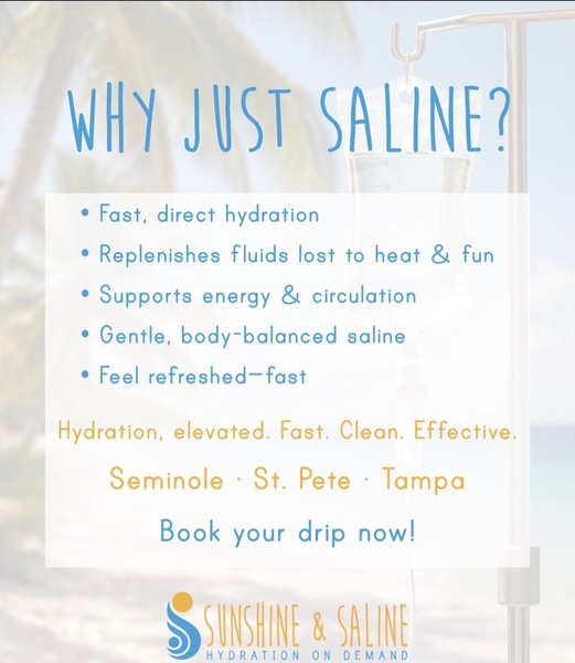 The "Just Saline" Philosophy-Sunshine & Saline differentiates itself from typical wellness "lounges" by intentionally limiting its offerings to 0.9% normal saline drips. Medical Rationale: The company operates on the belief that most individuals requiring IV therapy are primarily deficient in fluids and electrolytes, rather than the vitamins or medications often up-sold in complex "cocktails".Safety Focus: By excluding additives, they minimize the risk of adverse allergic or metabolic reactions, making the service safer for individuals with sensitivities or underlying health conditions.Transparency: This model allows for a flat-fee structure, eliminating the complex menus and hidden costs common in the mobile IV industry.Gallery