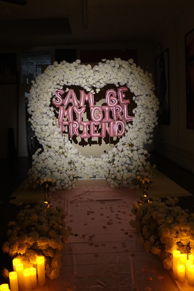 Create an unforgettable girlfriend proposal with our Heart Arch (White) experience. A freestanding heart arch lush with white blooms and greenery sets a romantic scene, styled with candles and rose petals. Package includes custom foil-balloon signage