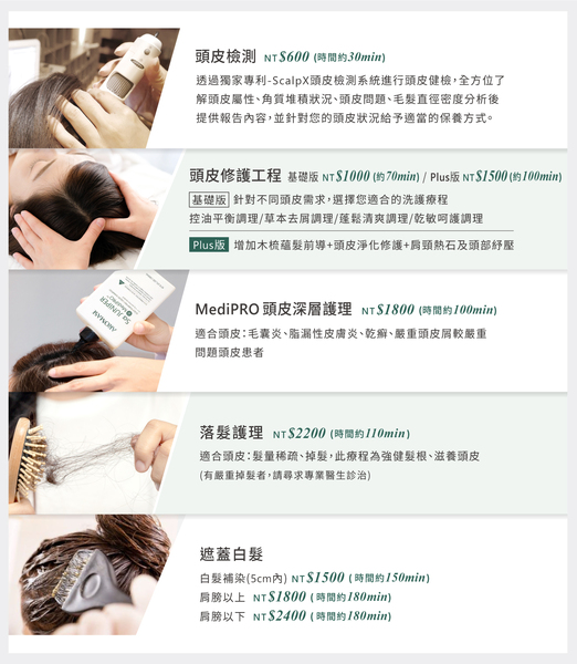 NT$2500 (約110min) 適合頭皮:髮量稀疏、掉髮,此療程為強健髮根、滋養頭皮(有嚴重掉髮者,請尋求專業醫生診治)