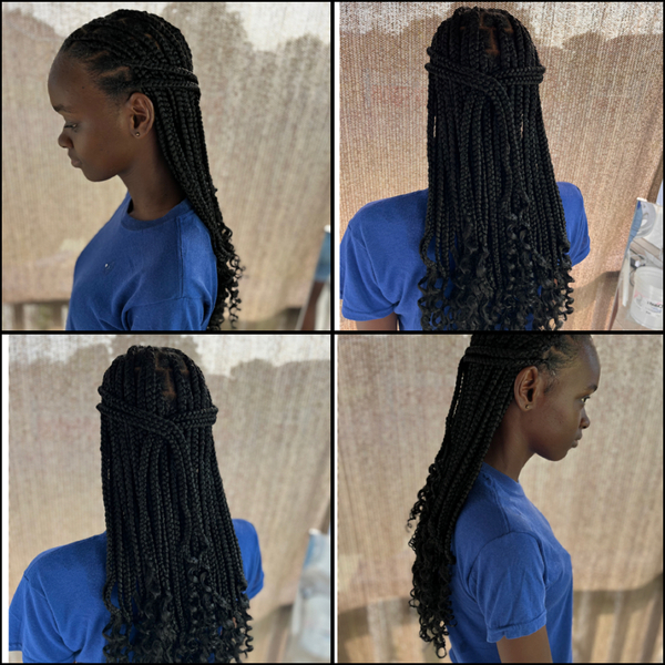 Our "Jumbo butterfly braids with cornrows at the front" service is a stunning and bold choice for those looking to make a statement with their hairstyle. This intricate style features jumbo butterfly braids complemented by cornrows at the front, crea