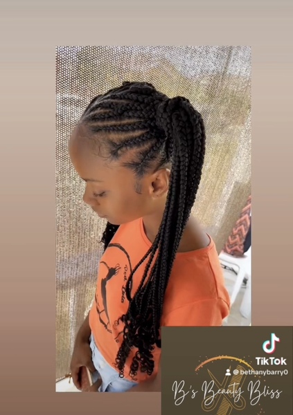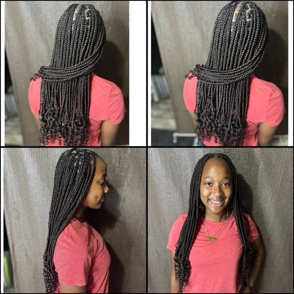 Our professional hairstylists specialize in providing the Girl's Knotless Mid-Back Length (Medium) service. With this style, we use two packs of Kids Expression Braids (20") to achieve a stunning look. To ensure optimal results, please note that prio