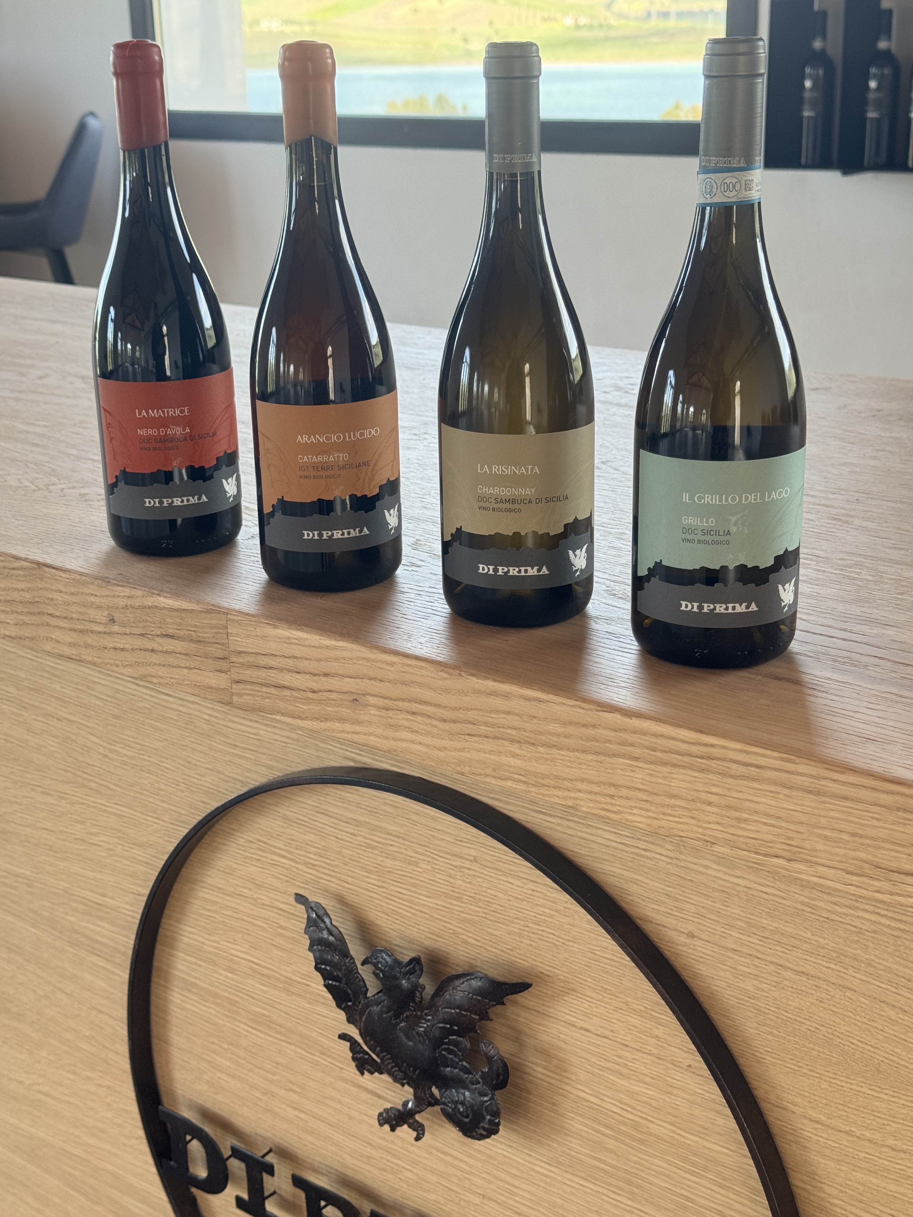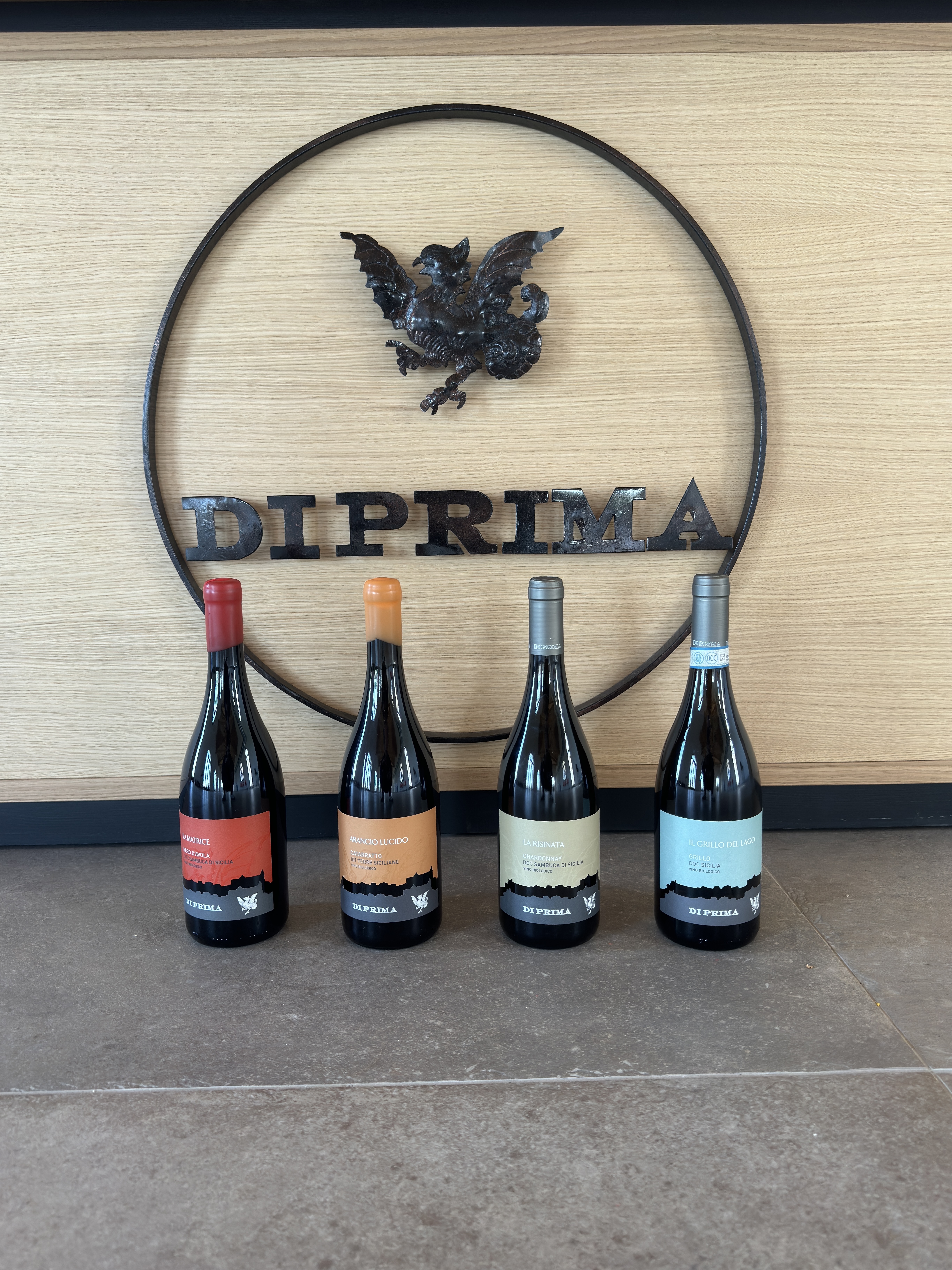 the tasting includes: the Organic Grillo del Lago DOC Sicilia, the Organic La Risinata Chardonnay DOC Sambuca di Sicilia, the Organic Catarratto IGT Terre Siciliane Lucido Orange and the Organic La Matrice Nero d'Avola DOC Sambuca di Sicilia La