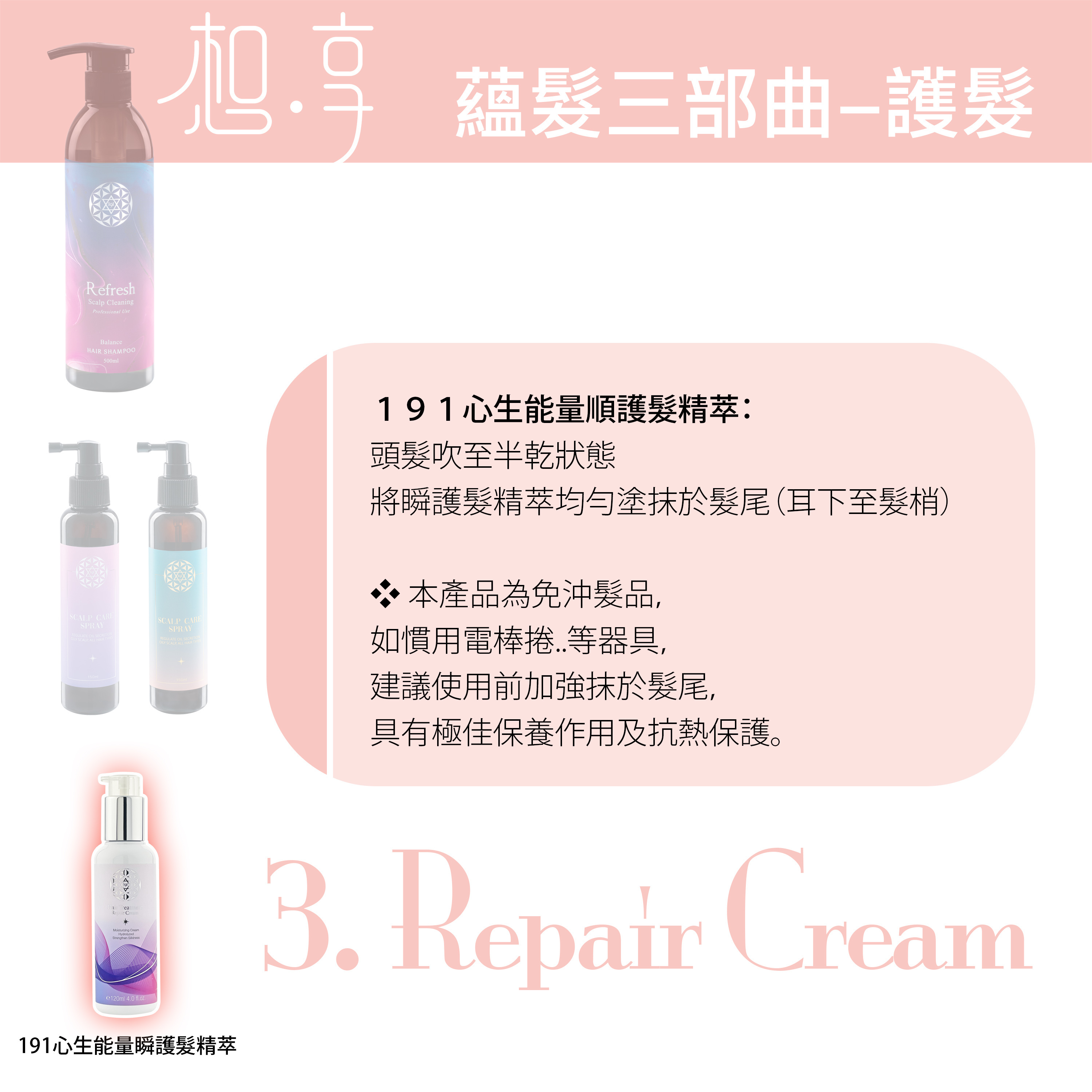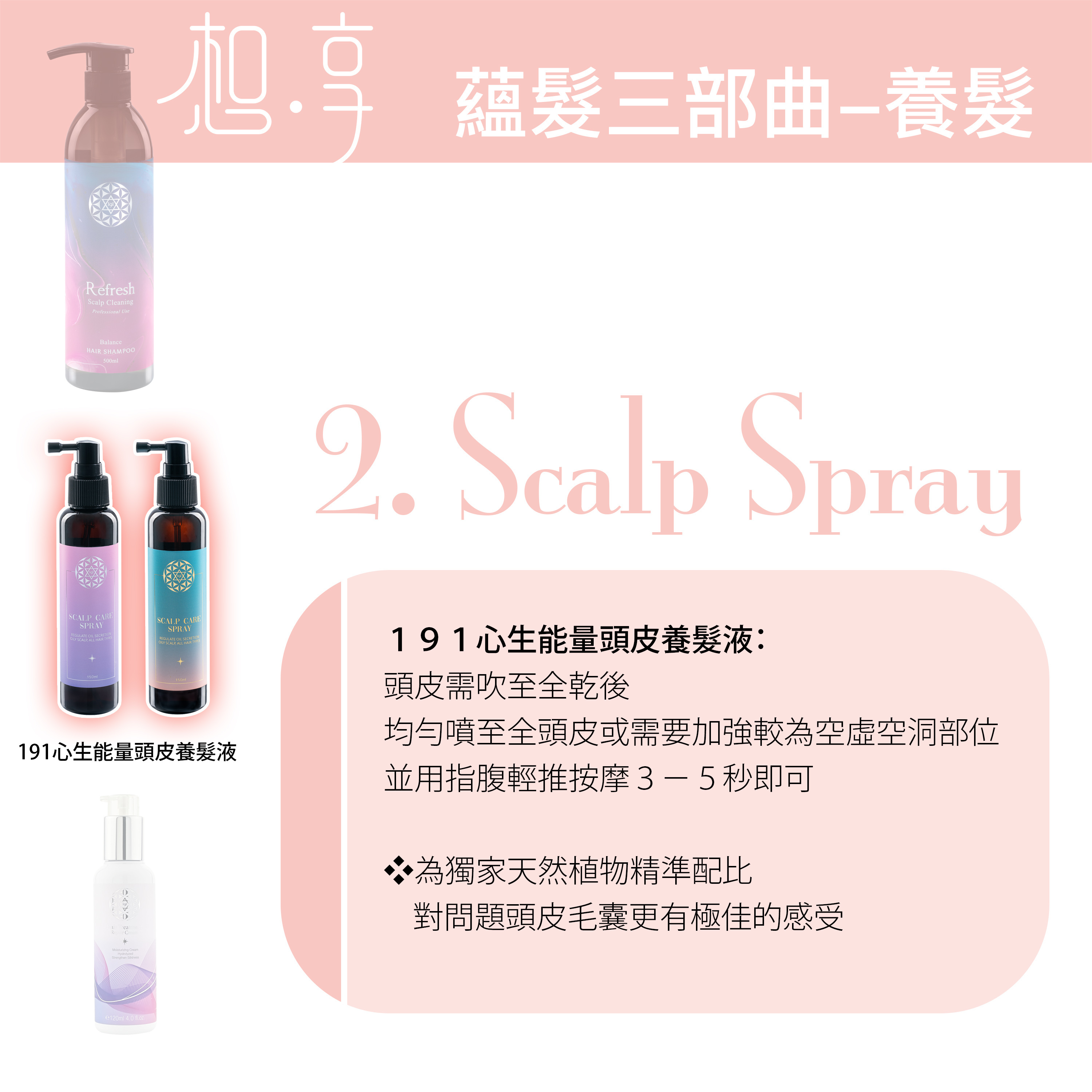 諮詢→梳療→植萃髮浴→強化髮芯→藴髮→頭皮檢測