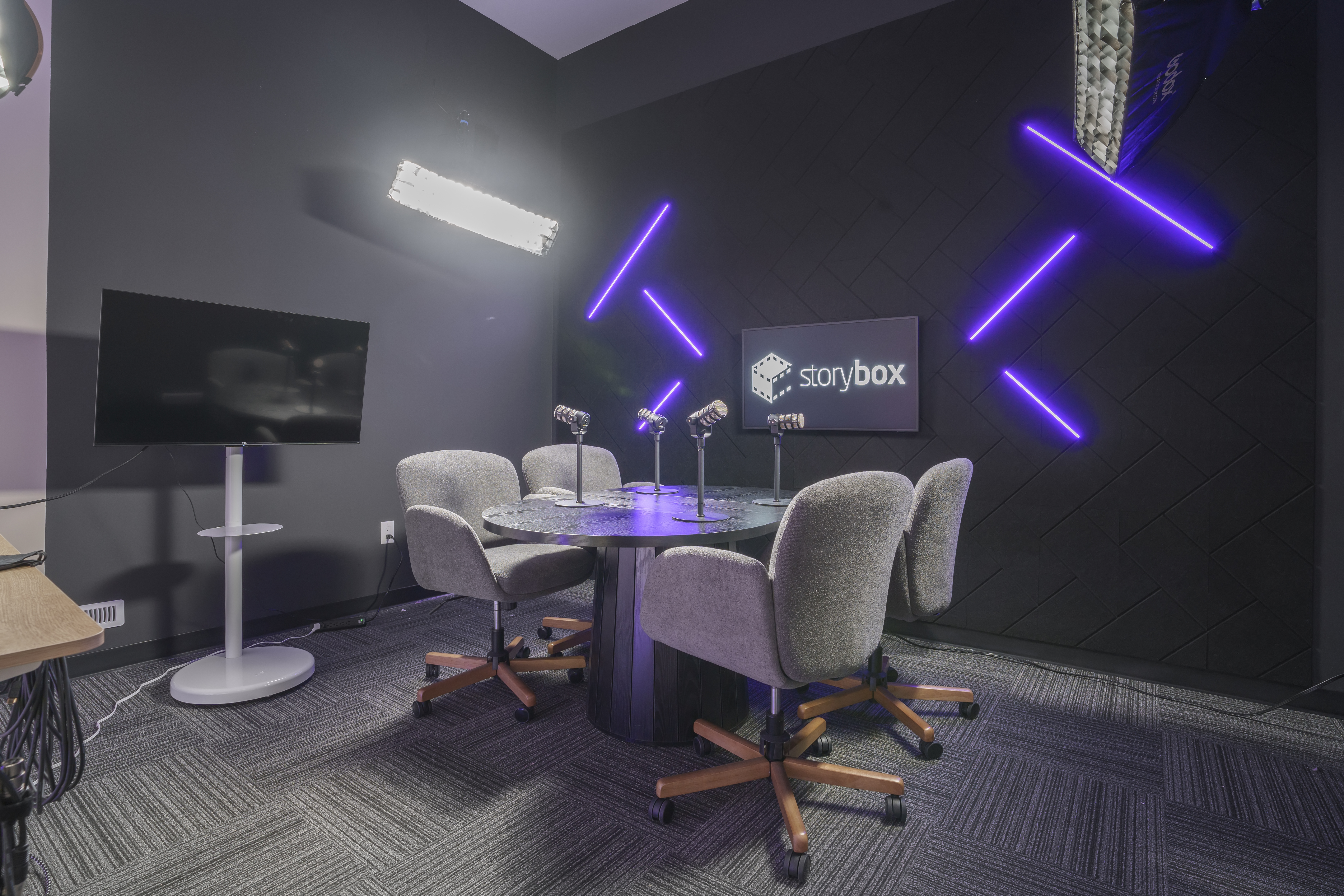 Perfect for recording 1–2 episodes in a controlled, professional environment. Ideal for solo creators or interview-style episodes.Includes:● Two dedicated podcast set options serving 2 to 4 people (light and dark theme)● Fully equipped with
