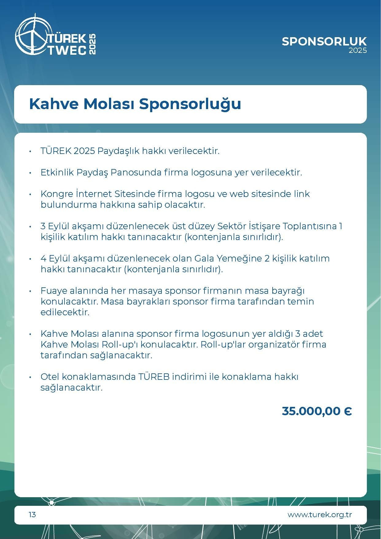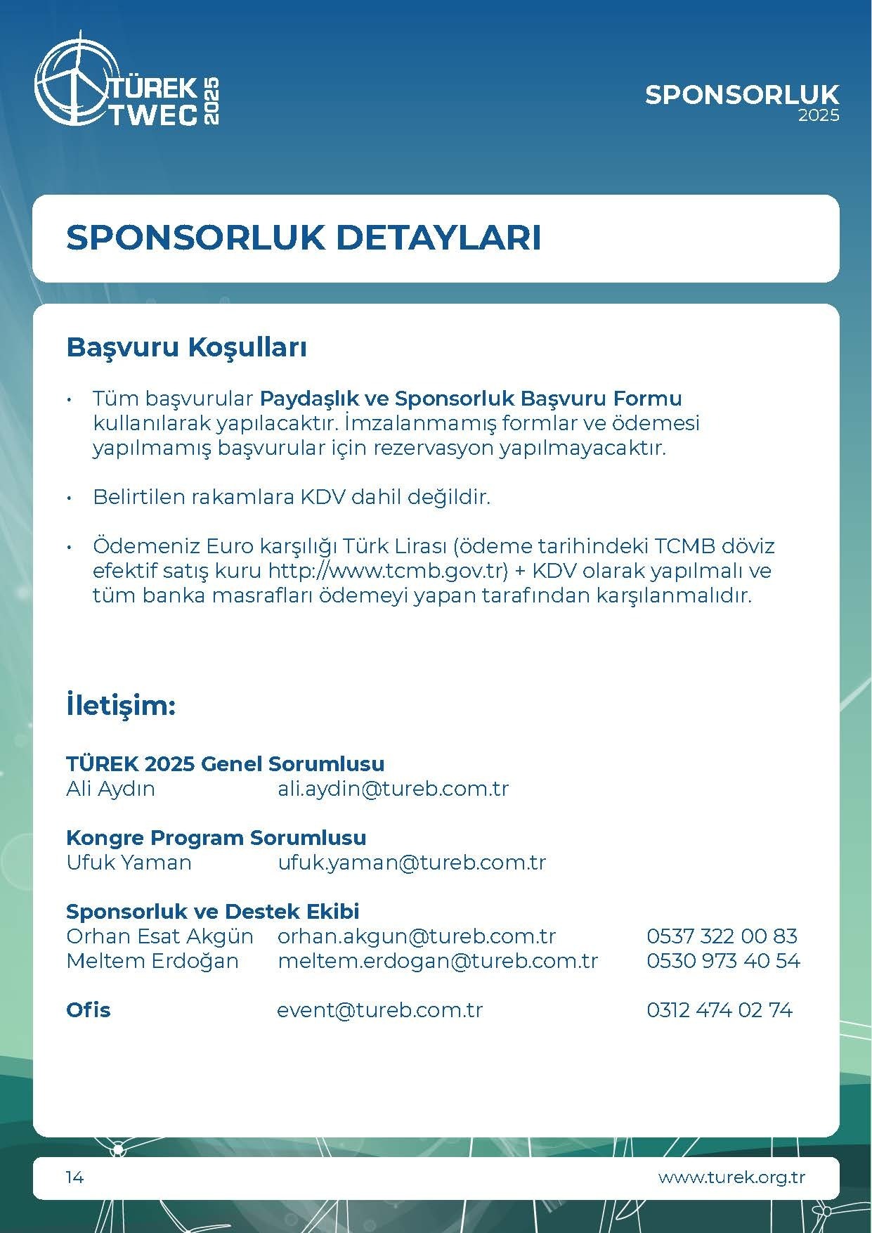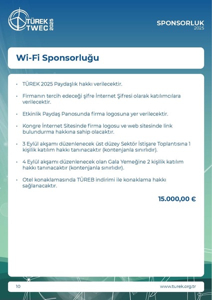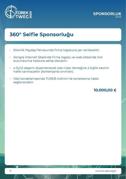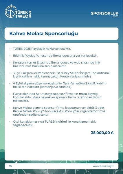 * KDV Oranı %20 olarak uygulanmaktadır.• TÜREK 2025 Paydaşlığına ek olarak alınabilir.• Etkinlik Paydaş Panosunda firma logosuna yer verilecektir.• Kongre İnternet Sitesinde firma logosu ve web sitesinde linkbulundurma hakkına sahip olacaktır.• Terci