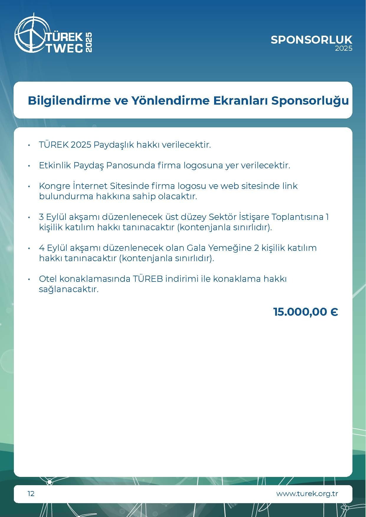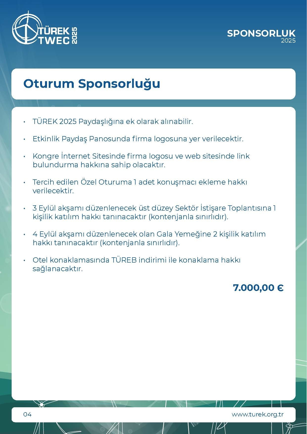 * KDV Oranı %20 olarak uygulanmaktadır.• TÜREK 2025 Paydaşlık hakkı verilecektir.• Firmanın tercih edeceği şifre İnternet Şifresi olarak katılımcılaraverilecektir.• Etkinlik Paydaş Panosunda firma logosuna yer verilecektir.• Kongre İnternet Sitesinde