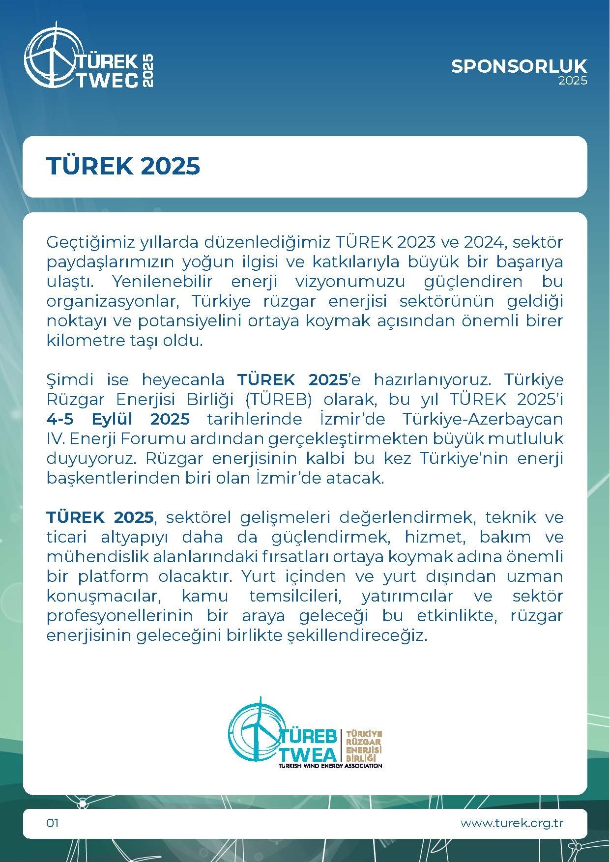 Türkiye’nin enerji dönüşüm yolculuğunda kilit rol oynayan, alanında ülkemizin tek ve en büyük organizasyonu olan Türkiye Rüzgar Enerjisi Kongresi – TÜREK 2025, bu yıl 4-5 Eylül 2025 tarihlerinde Hyatt Regency İzmir İstinyepark’ta gerçekleşiyor! Bu yıl TÜREK’i çok daha özel ve uluslararası bir boyuta taşıyacak olan IV. Türkiye – Azerbaycan Enerji Forumu ilk kez TÜREK ile eş zamanlı ve eş mekânda organize ediliyor! Bu iş birliği sayesinde, yalnızca Türkiye’nin değil, Avrasya bölgesinin enerji vizyonunu şekillendiren karar vericiler, yatırımcılar ve lider kurumlar İzmir’de aynı çatı altında buluşacak. Ortak oturumlar, özel paneller ve yüksek düzeyli temaslarla iki ülke arasında güçlü bir sinerji yaratılması hedefleniyor. Her yıl Türkiye Rüzgar Enerjisi Birliği tarafından düzenlenen TÜREK, sektörde yalnızca bir kongre olmanın çok ötesinde, fikirlerin projeye, projelerin yatırıma dönüştüğü eşsiz bir etkileşim sahnesidir. Kamudan özel sektöre, sanayiden finansmana kadar rüzgar ekosisteminin tüm bileşenlerini buluşturan TÜREK, marka bilinirliğini artırmak, stratejik iş birlikleri geliştirmek ve sektörel görünürlük kazanmak isteyen tüm aktörler için vazgeçilmez bir platform sunmaktadır. Neden TÜREK 2025’te yer almalısınız? • Sektörün öncü kamu kurumları ve global şirketleriyle aynı sahnede yer alma ayrıcalığı • Politika yapıcılarla birebir temas kurarak vizyon geliştirme fırsatı • Yüzlerce medya mecrasında görünürlük imkânı ve güçlü iletişim desteği • Özel stant alanlarında ürün ve çözümlerinizi doğrudan hedef kitleyle buluşturma avantajı • Ağ kurmaya odaklı oturumlar ve sosyal etkinliklerle uzun vadeli iş ilişkileri geliştirme zemini • Bölgesel enerji iş birlikleri ve uluslararası açılımlar için güçlü bir temas ortamı Geçtiğimiz yıllarda 4.000’i aşkın katılımcı, onlarca sponsor ve birçok sektör devini bir araya getiren TÜREK, bu yıl İzmir’in enerjisi ve Azerbaycan iş birliğinin gücüyle yepyeni bir boyuta taşınıyor. Bu büyük buluşmada sponsorluk desteğiyle ya da stant alanınızla yer alarak, yalnızca markanızı ön plana çıkarmakla kalmaz, aynı zamanda Türkiye’nin ve bölgenin sürdürülebilir enerji geleceğinde aktif rol alan bir paydaş olarak konumlanırsınız.作品图集