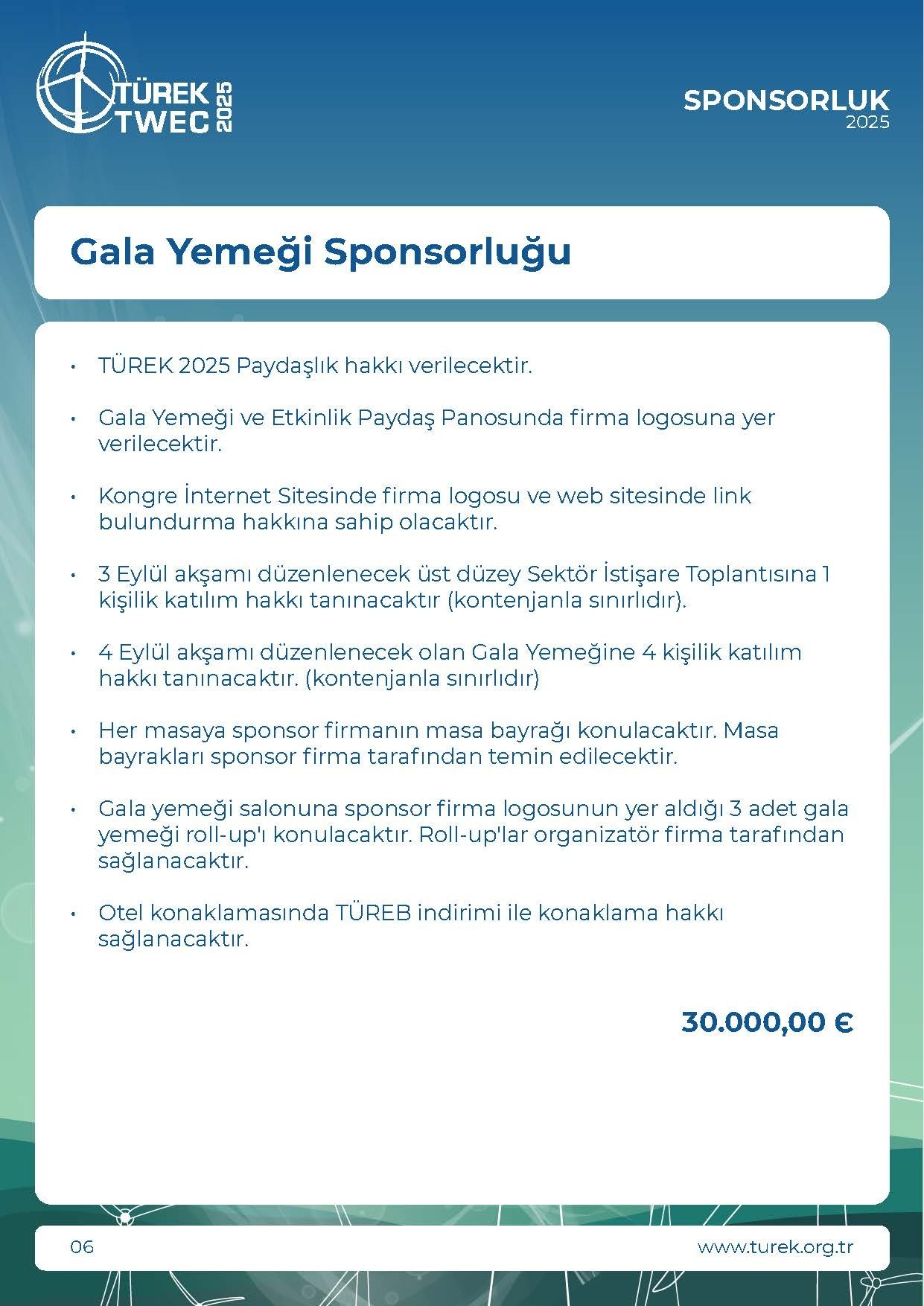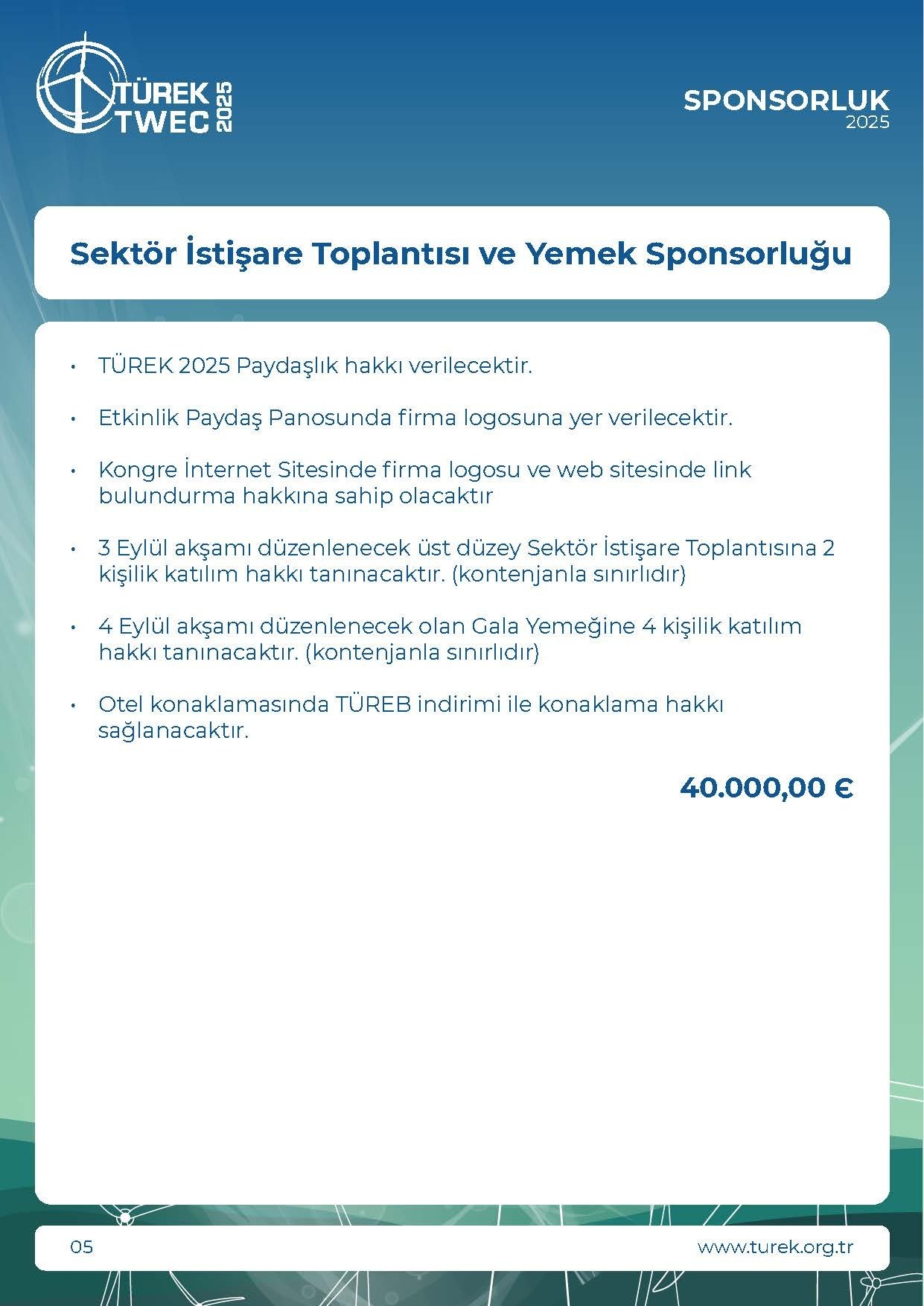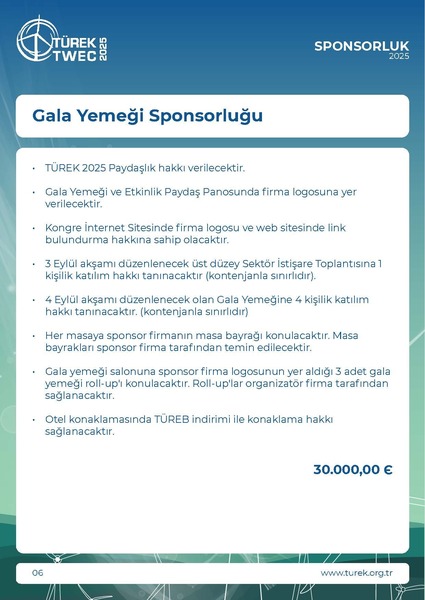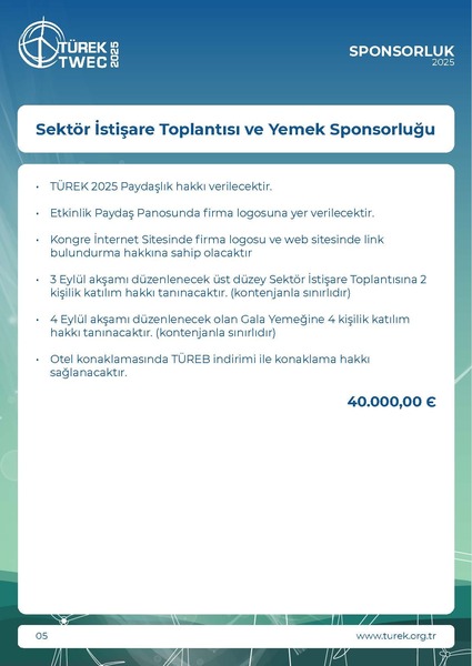 * KDV Oranı %20 olarak uygulanmaktadır.• TÜREK 2025 Paydaşlık hakkı verilecektir.• Gala Yemeği ve Etkinlik Paydaş Panosunda firma logosuna yerverilecektir.• Kongre İnternet Sitesinde firma logosu ve web sitesinde linkbulundurma hakkına sahip olacaktı