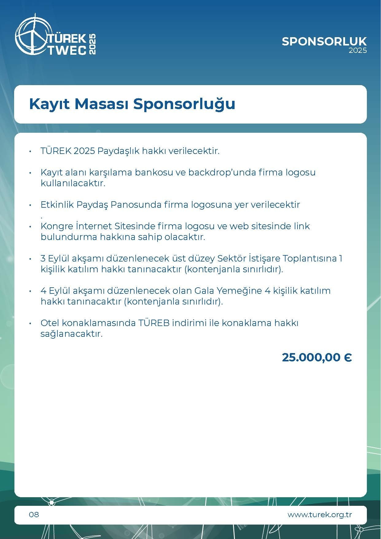 * KDV Oranı %20 olarak uygulanmaktadır.• TÜREK 2025 Paydaşlık hakkı verilecektir.• Kayıt alanı karşılama bankosu ve backdrop’unda firma logosukullanılacaktır.• Etkinlik Paydaş Panosunda firma logosuna yer verilecektir• Kongre İnternet Sitesinde firma