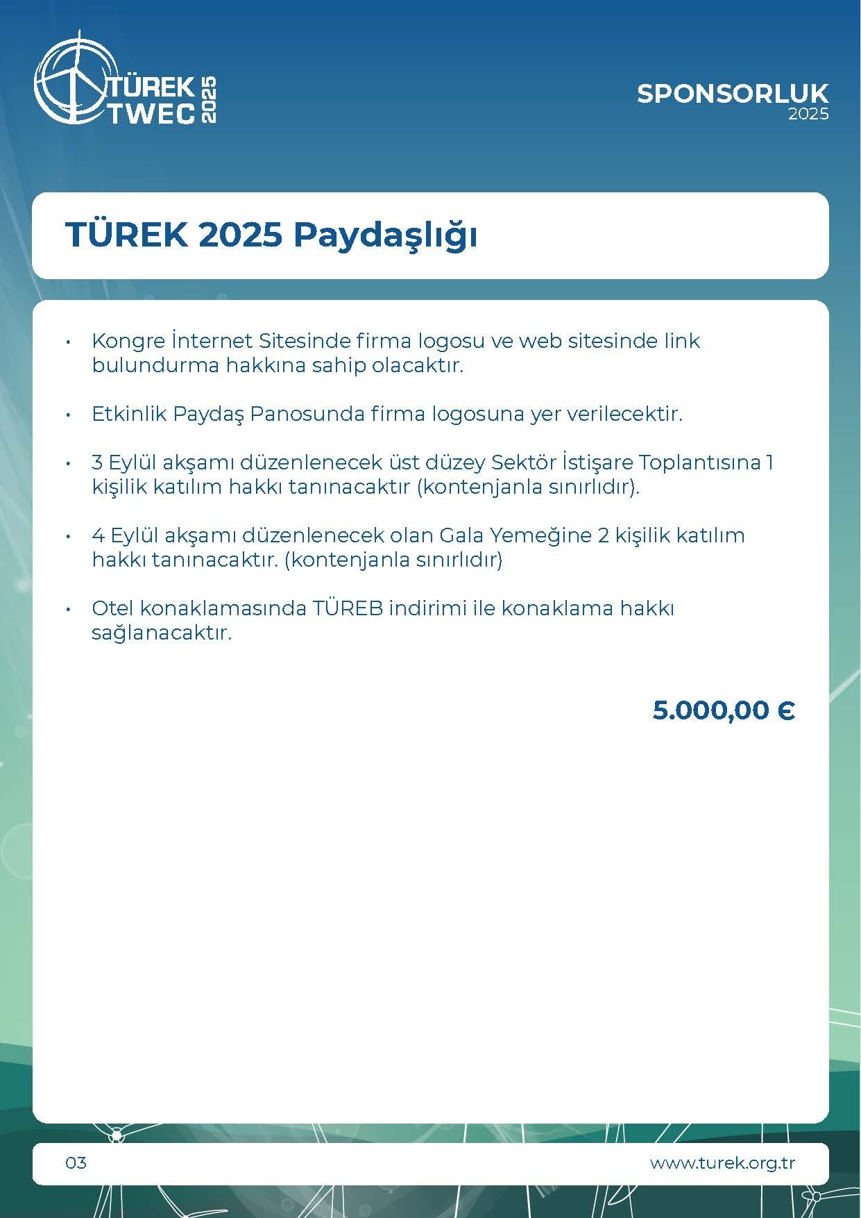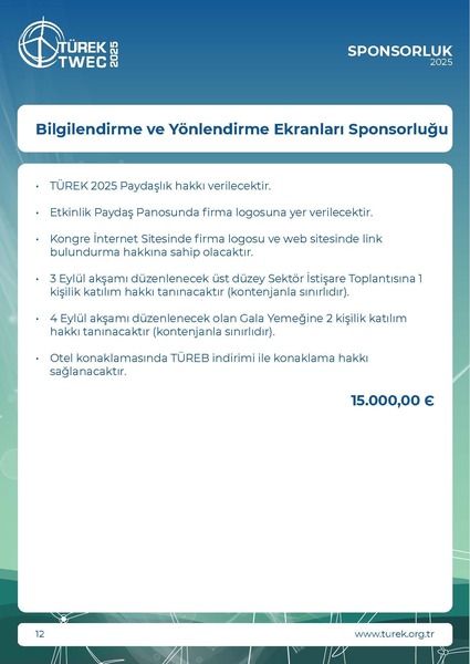 * KDV Oranı %20 olarak uygulanmaktadır.• Etkinlik Paydaş Panosunda firma logosuna yer verilecektir.• TÜREK 2025 Paydaşlık hakkı verilecektir.• Katılımcılara verilecek olan yaka kartları üzerinde firma logosuna yerverilecektir.• Kongre İnternet Sitesi