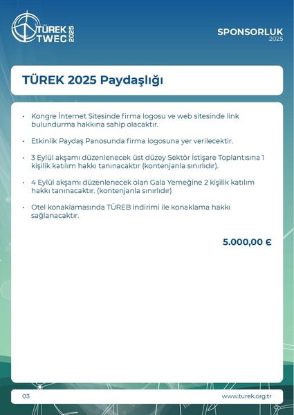 * KDV Oranı %20 olarak uygulanmaktadır.• TÜREK 2025 Paydaşlık hakkı verilecektir.• Etkinlik Paydaş Panosunda firma logosuna yer verilecektir.• Kongre İnternet Sitesinde firma logosu ve web sitesinde linkbulundurma hakkına sahip olacaktır• 3 Eylül akş