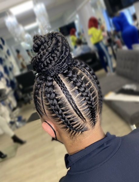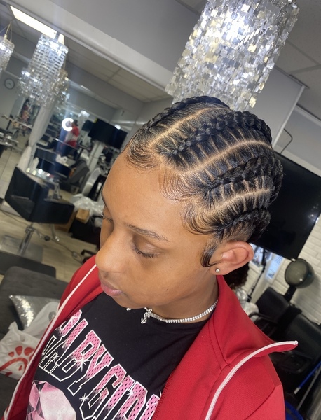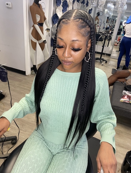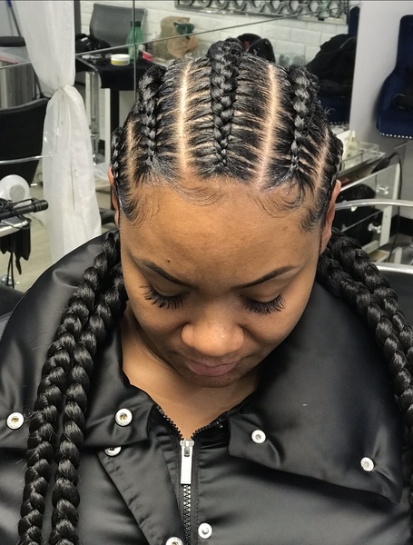 4 feed in braids. Hair is not included must bring 3 to 4 packs (check FAQ for hair brand). **must come washed and blow-dried (no products/oil) unless added on while booking**