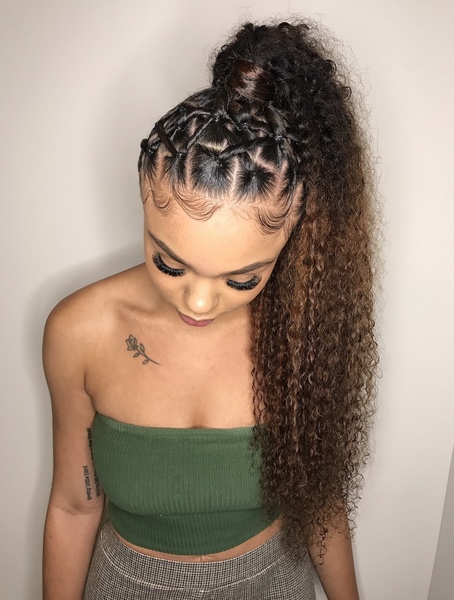 2 feed in braids with curly ends. Hair is not included must bring 1 pack of braiding hair (check FAQ for hair brand) and one bundle of curly/wavy weave hair. **must come washed and blow-dried (no products/oil) unless added on while booking**