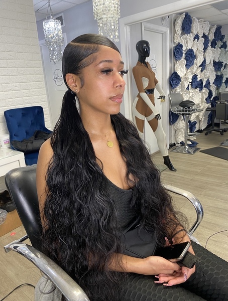 Hair will be pressed and molded into two ponys and extensions will be added to the bottom. Must bring 2 bundles of weave hair.**must come washed and blow-dried (no products/oil) unless added on while booking**