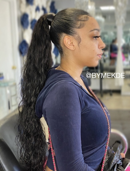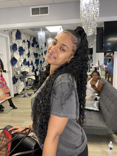 Quick weave in the back, pony on top. Three bundles required.**must come washed and blow-dried (no products/oil) unless added on while booking**