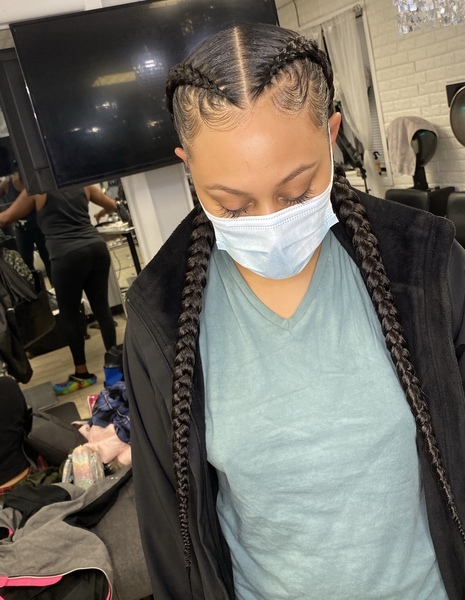 2 feed in braids. Hair is not included must bring 3 to 4 packs (check FAQ for hair brand). **must come washed and blow-dried (no products/oil) unless added on while booking**