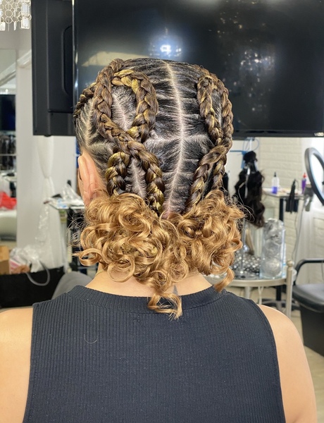 4 feed in braids with 2 curly Bunz. Hair is not included must bring 1 pack braiding hair (check FAQ for hair brand) and one pack curly crochet hair. **must come washed and blow-dried (no products/oil) unless added on while booking**