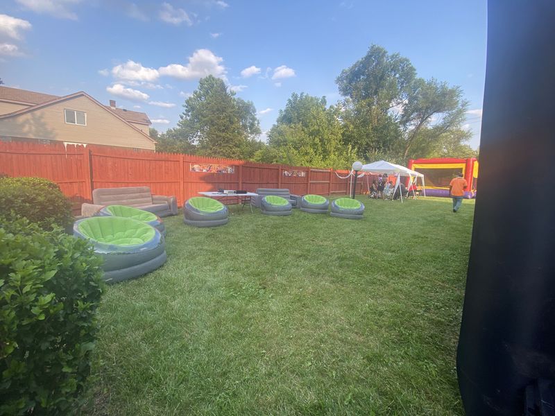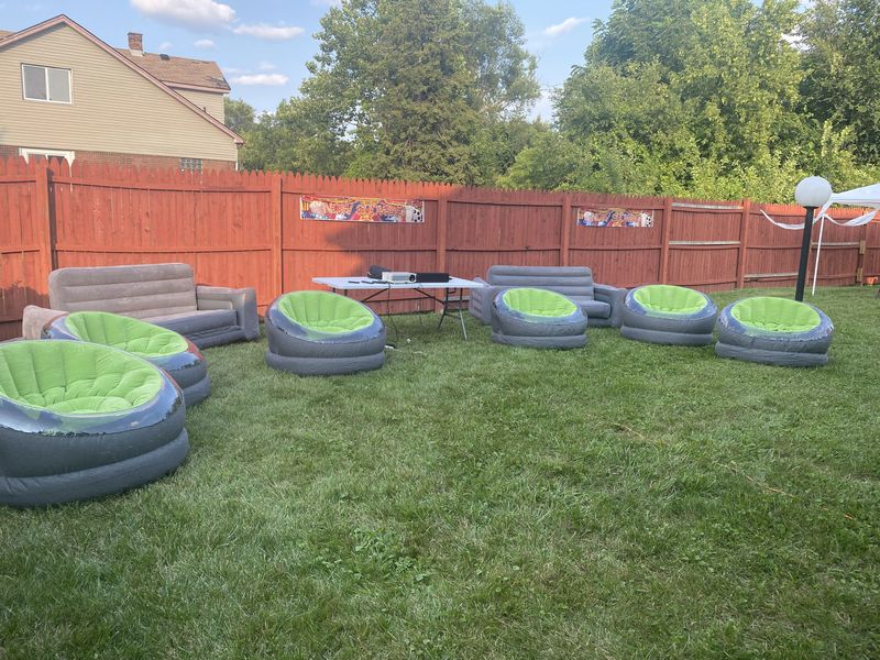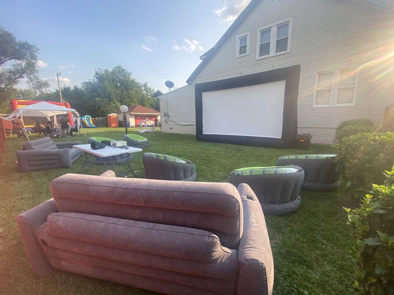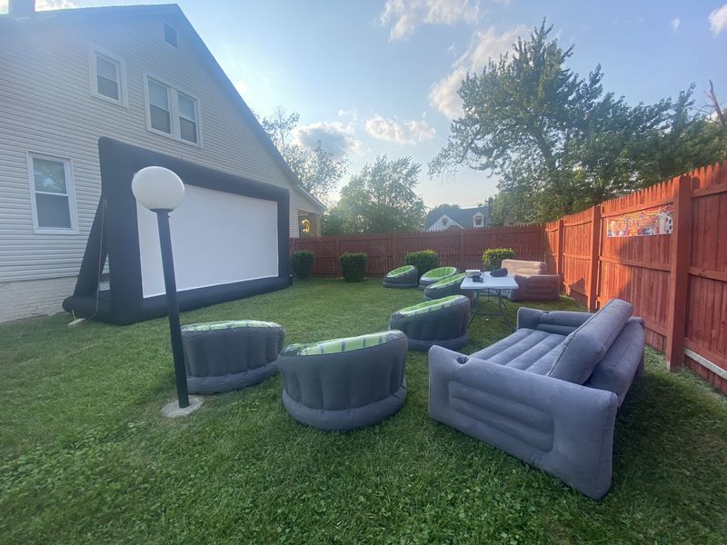NOW ACCEPTING SEPTEMBER BOOKINGS! PLEASE READ OUR TERMS AND CONDITIONS IN FULL BEFORE BOOKING.Our party package includes: 20 ft Inflatable Projector Screen1080P 4K Compatible ProjectorSoundbar Speaker2 Inflatable Loveseats6 Inflatable Chai
