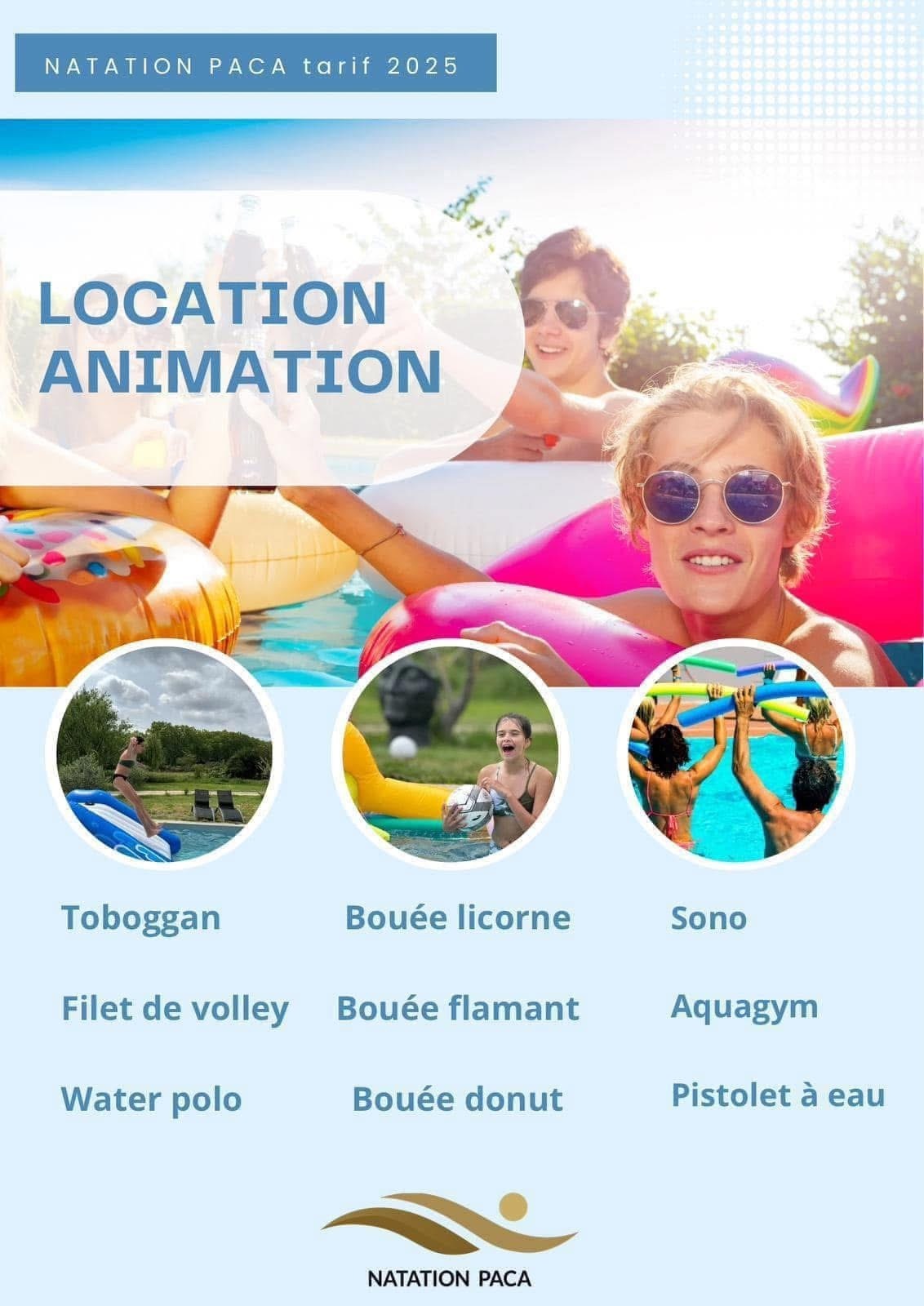 La service comprend :- Le maître nageur diplomé, assuré qui s'occupe de l'animation et de la sécurité- Le toboggan* ( Deux toboggan au choix ) - Les jeux gonflables, filet de volley, panier de basket, cage de waterpolo, bouées ballons ....- Peti