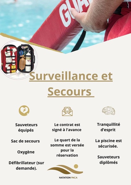 Le forfait comprend:- Un sauveteur diplomé et assuré - Un sac de secours avec oxygène et matériel professionnel- Frais de transport offert à partir de 5h de prestationTarifs: 40 Euros TTC / H - En option : Un défibrillateur +36Euros TTC / H
