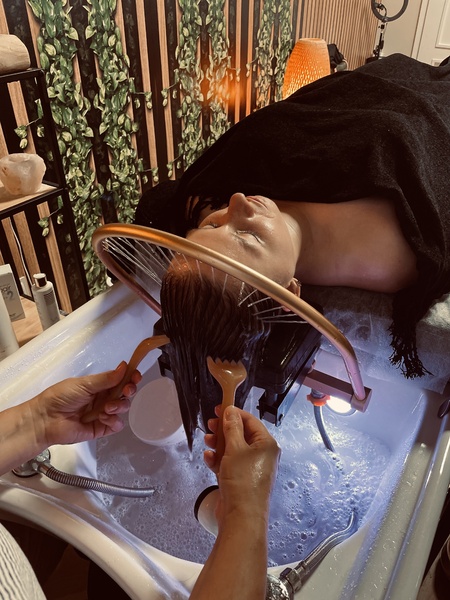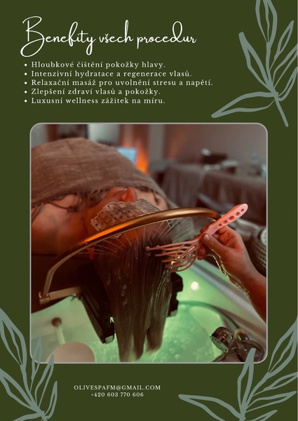 OLIVE Hair & Head Spa. Luxusní péče o vlasy, pokožku hlavy a Vaše smysly. Jsme místem, kde zmizí starosti, tělo se uvolní a mysl nalezne klid. HEAD SPA není jen péče o vlasy a pokožku hlavy, ale cesta k harmonii a relaxaci inspirovaná japonskou tradicí. Spojení luxusní péče a hlubokého odpočinku vytvoří svět, kde se čas zastaví jen pro Vás. RITUÁLY: SILVER - Profesionální péče pro osvěžení a revitalizaci. GOLD - Hloubkový rituál s výživnou vlasovou ampulí na míru. PLATINUM - Nejluxusnější procedura s maximálním regeneračním účinkem. MEN CARE RITUAL - Speciální péče pro muže zaměřená na prevenci vypadávání vlasů a jejich obnovu.Gallery