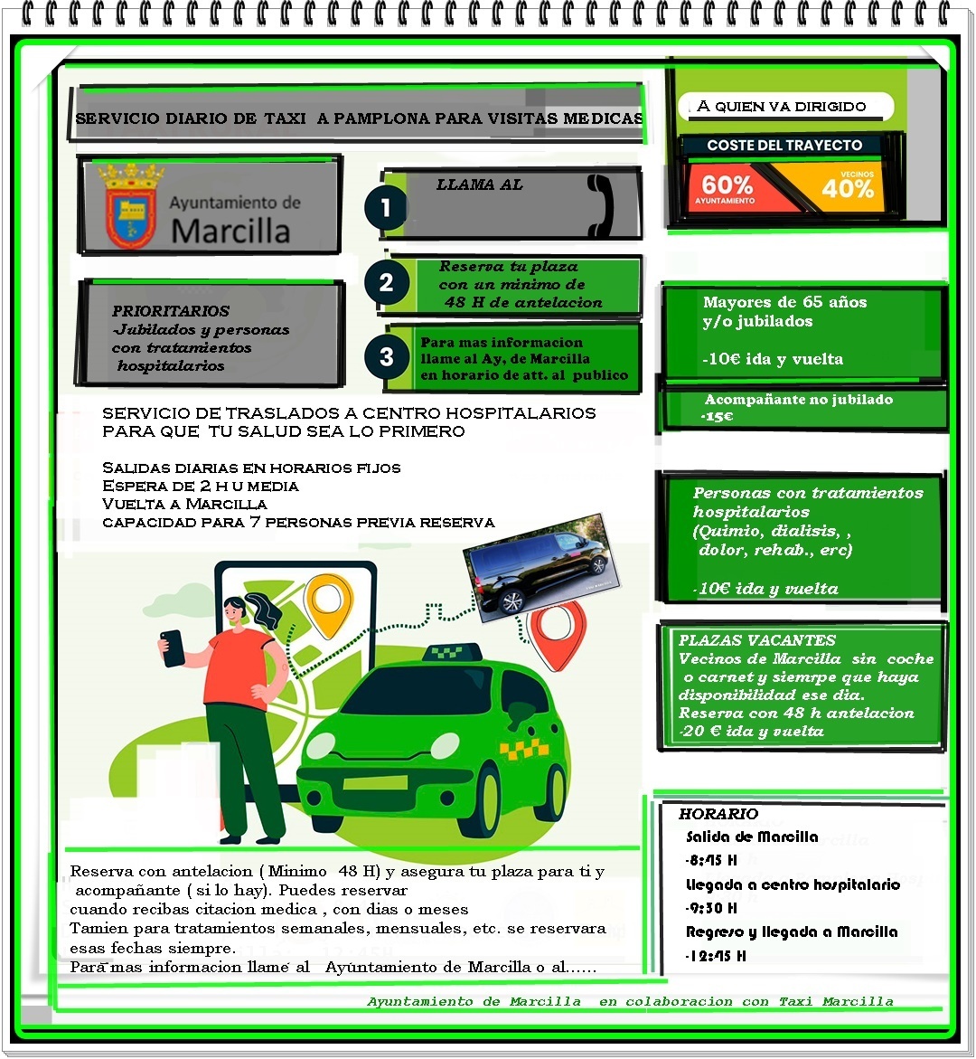 Taxi Marcilla, ubicado en Marcilla,-Navarra, ofrece servicios diarios de taxi hacia Pamplona para visitas médicas.Está dirigido a jubilados, mayores de 65 años, y personas con tratamientos médicos regulares ( Quimioterapia, unidad de dolor, revisiones periódicas , etc) Este servicio no tiene limitación de edad Puede ser un acompañante por paciente, que ocupará una plaza, con lo que debe reservar 2 plazas en estos casos. Para conocer las plazas vacantes solo entra en esta web, pincha en reservar y aparecerá un calendario. Pincha en el día del mes que necesites reservar y aparecerán 7 recuadros que son las 7 plazas que hay diarios. No importa la hora que ponga ya que es por defecto, sino la plaza o plazas que necesites. Automáticamente te saldrá un billete con la referencia de la reserva y ya esta. No hay que pagar en línea ni meter ningún dato bancario. Solo nombre y apellidos y una dirección de correo electrónico. , Para más información o reservas contactar directamente al 620 12 62 99 de lunes a viernes de 9:00 a 12:00. ¡Servicio financiado por el AYUNTAMIENTO DE MARCILLA en colaboración con TAXI MARCILLA HORARIO RUTA DIARIA Salida de Marcilla desde la parada de taxi 8:50 H Salida de Pamplona( vuelta) 12;15 HGallery
