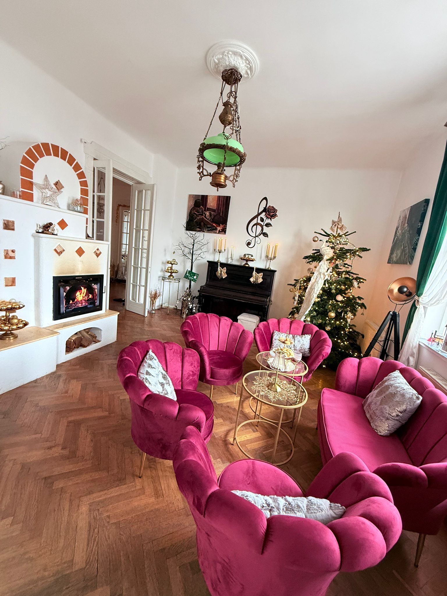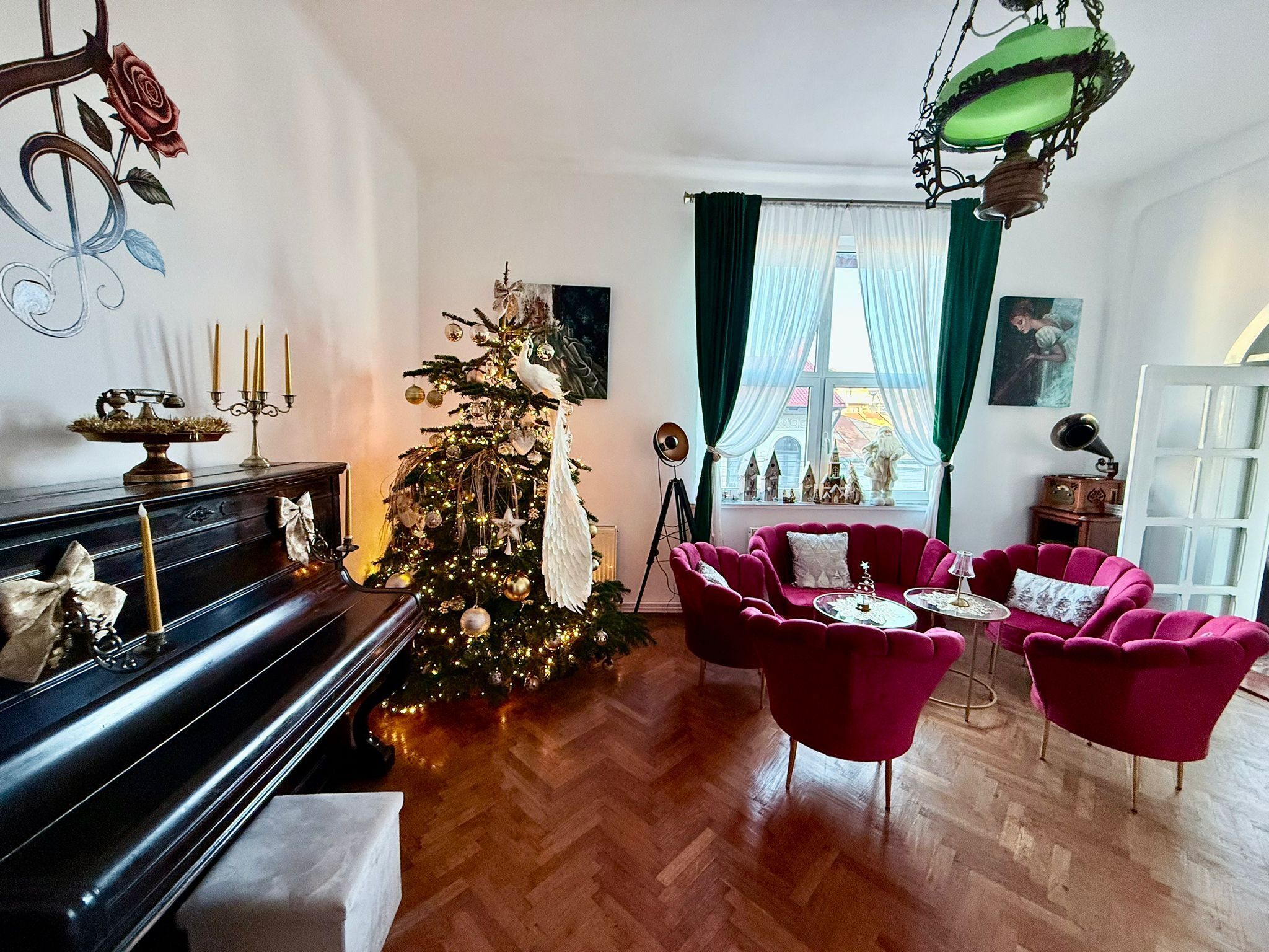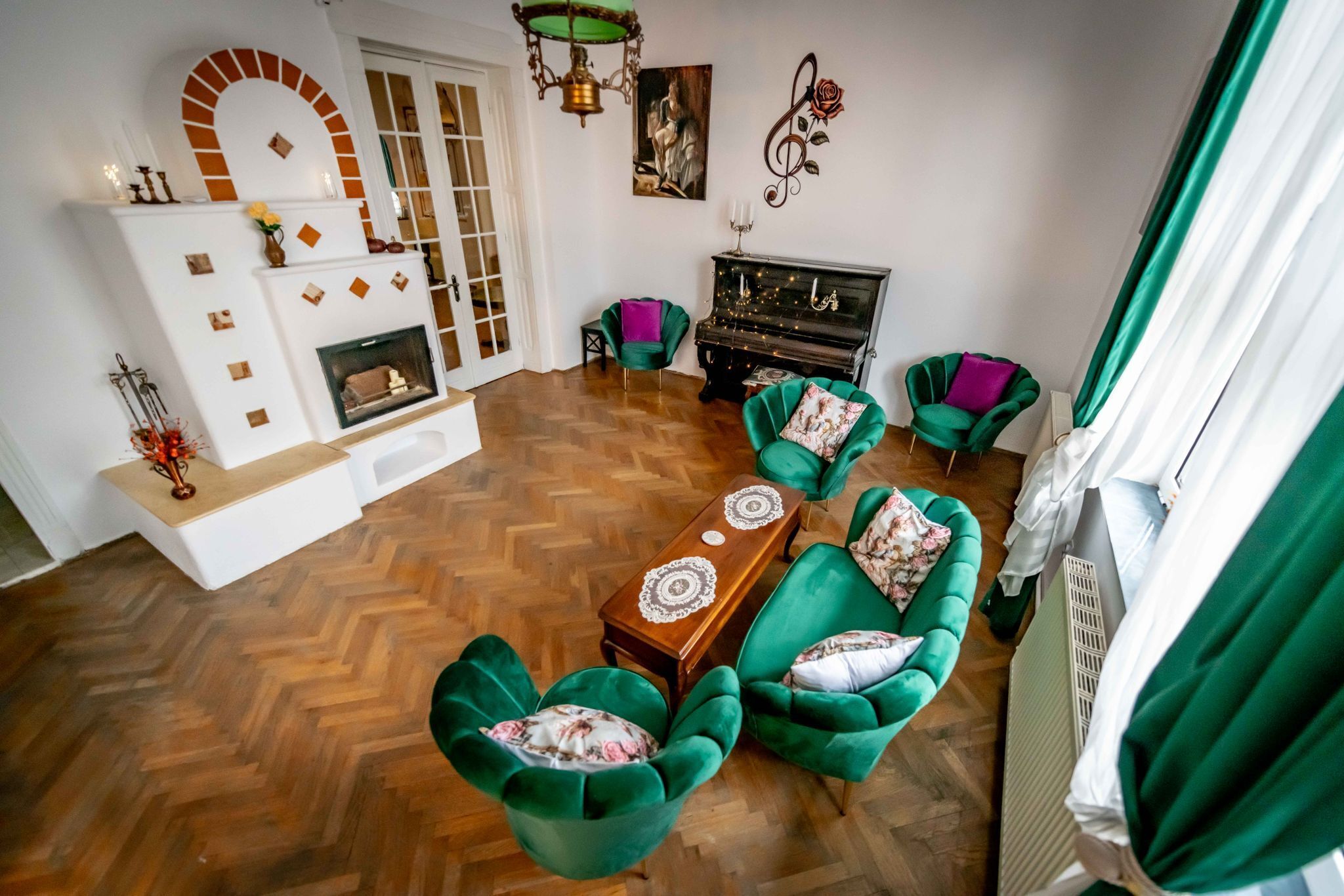 Pentru după-amieze și seri liniștite petrecute cu prietenii sau familia, în jurul unei mese, cu ceai aromat și conversații care curg firesc.Salonul de Muzică de la Vila Florilor te primește într-un decor interbelic elegant, cu pianină, fotolii c