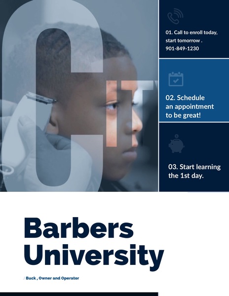 A New Barber School in the Memphis area 3 successful years open... hope to see you soon! Taking Barbering to the next level.2826 Coleman RdMemphis, Tn 38128Tuition $3500 no student financial assistance, pay as you go.Books $310Student Barber Kit $600Any question call (901) 859-1230 and ask for Mr. BuckThe most fun environment for learning and challenging experience in post secondary learning. 1. Course is 1500 clock hours.2. Practicals consists of safety and setup, haircutting, Shampooing, shaving, Facials, plain manicure, permanent waving, virgin color, thermal hairstyling and disinfection.3.Theory consists of hair cutting and styling, nail care/skin care, licensing and regulation for Tn, hair coloring and relaxing, sanitation, disinfection,and safety, Shampooing and conditioning hair.Come in and relax. Discount off services... ask me how to get half off. BarbersUniversity a place where you can B.U.Gallery
