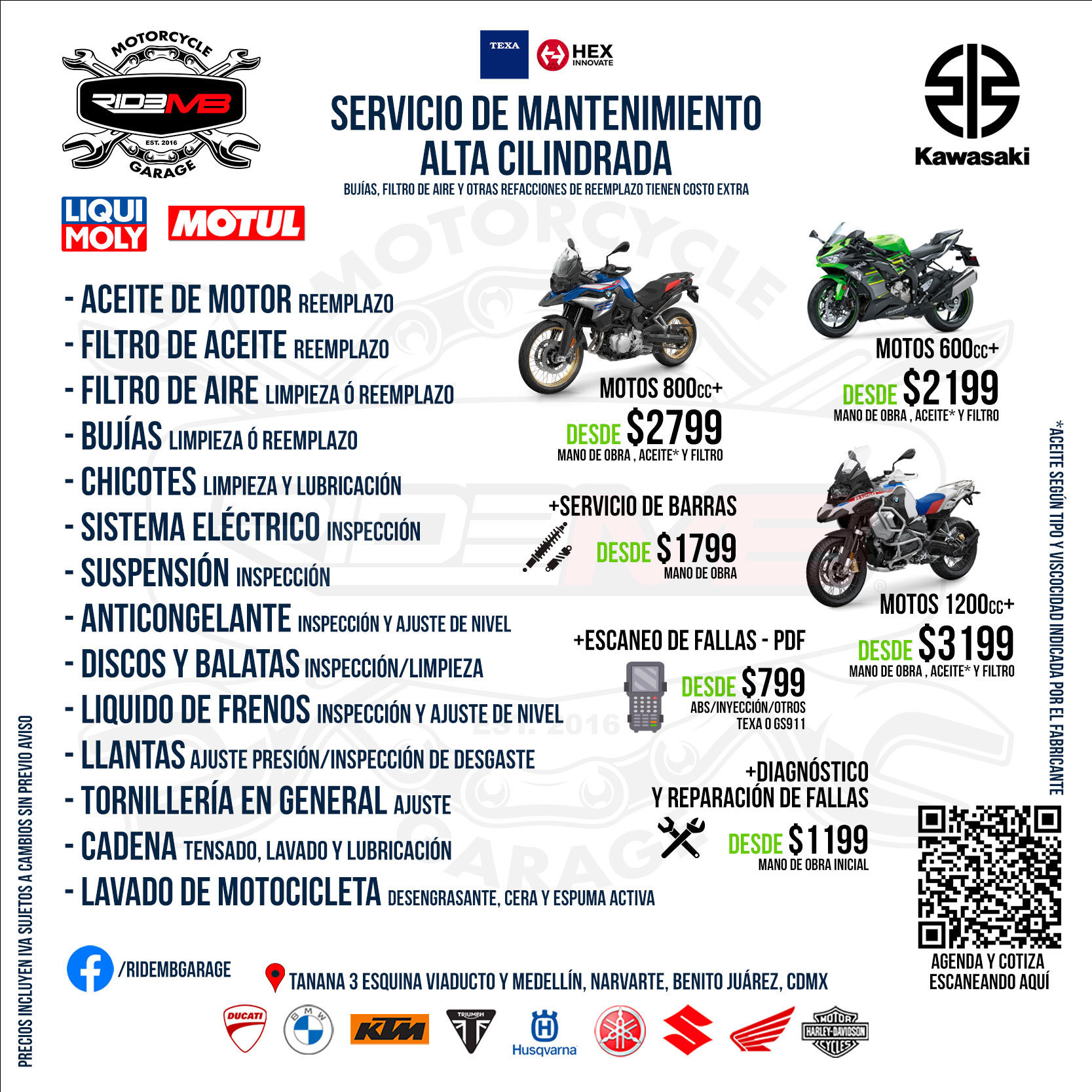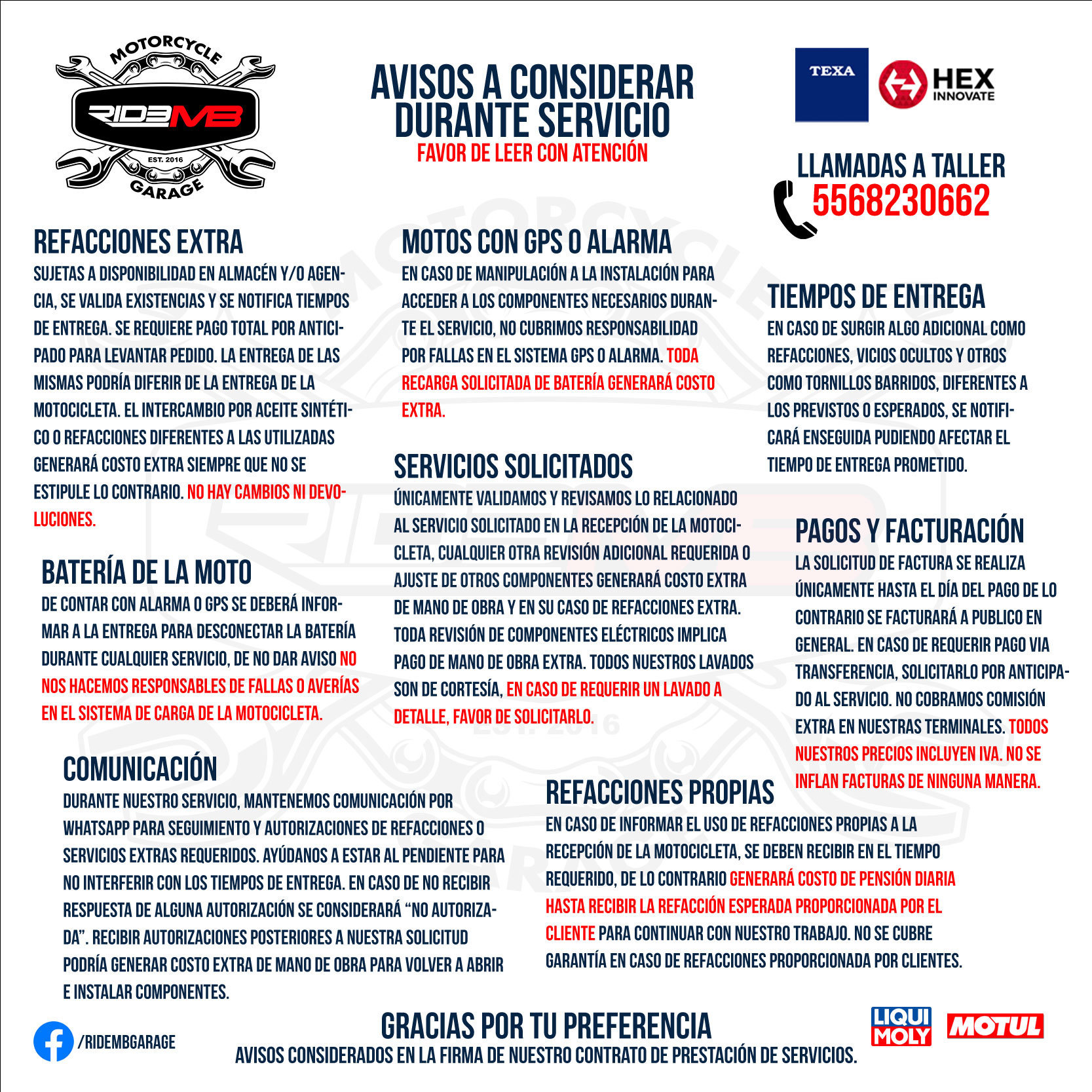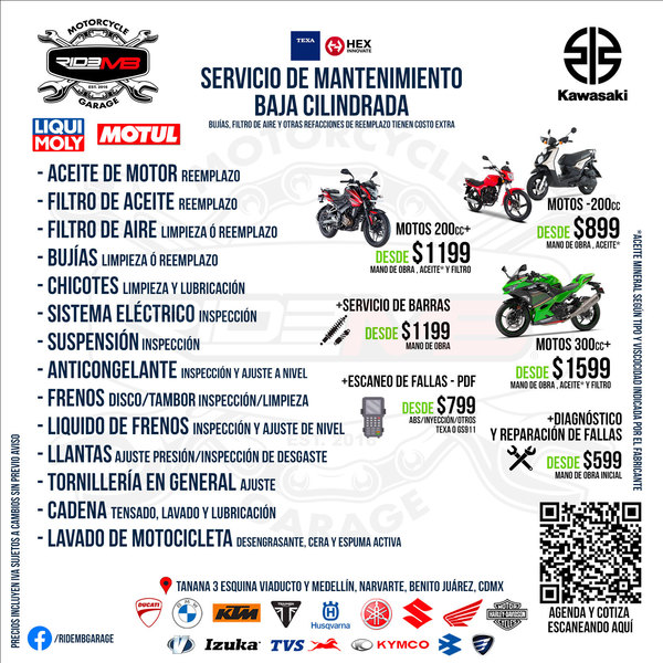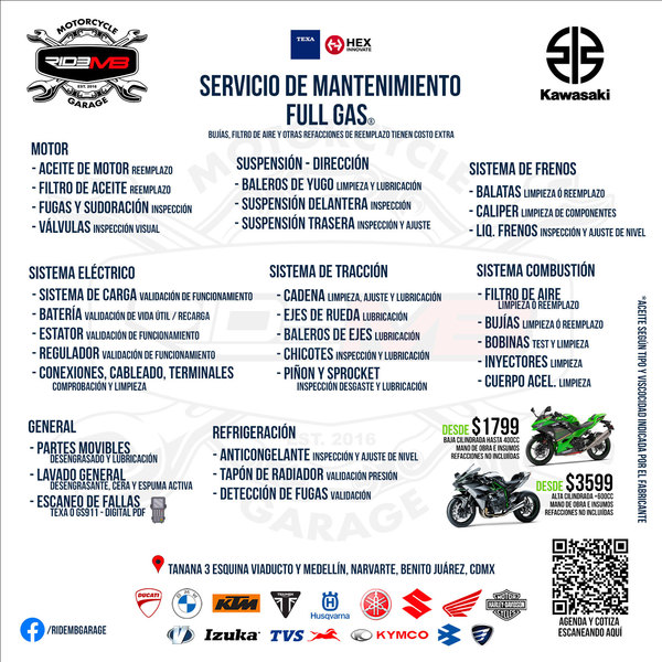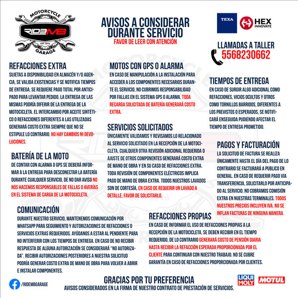 Cupo LIMITADO por DÍA - Entregaremos el mismo día siempre y cuando no se requiera alguna refacción EXTRA NO contemplada en tu Servicio Básico. El día de entrega podría variar y se notificará a la recepción de la moto.
