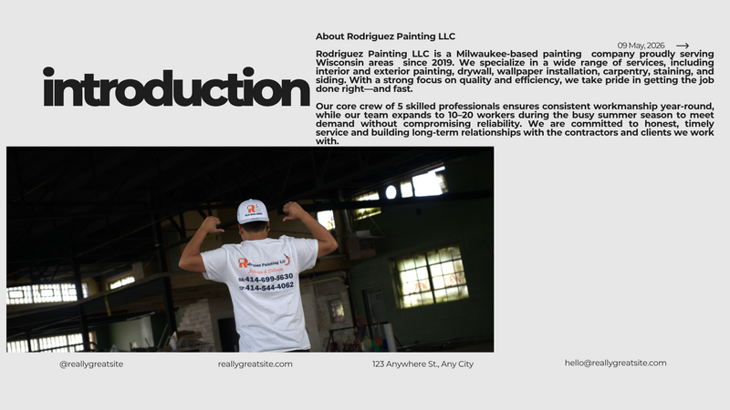 Rodriguez Painting LLC — The Team That Paints Your Dream!Serving Milwaukee and nearby areas, we provide professional painting, drywall, carpentry, siding, and remodeling services with pride and precision. Our family-run business is built on quality, reliability, and trust — transforming homes and businesses one project at a time. Call or book your free estimate today to experience the RP difference!Gallery