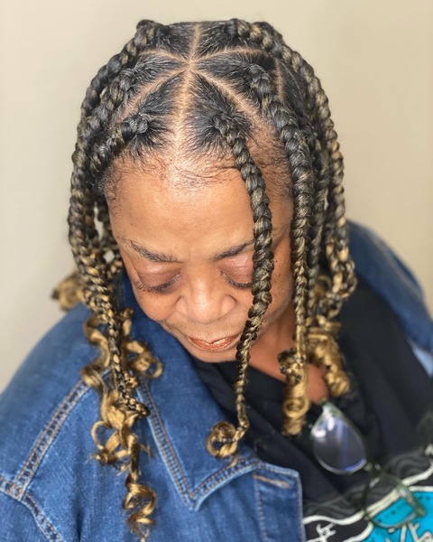 Real hair braided with extensions for the original box braid style shoulder length. Booking for ages 12 and under. Triangle parting also available at no extra charge