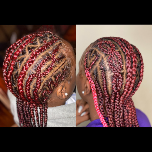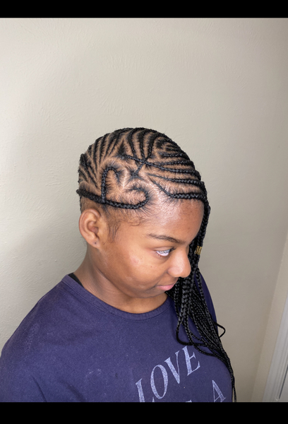 Cornrow braids uniquely designed for you. Size & Designs can vary from butterflies, hearts, criss-cross and zig-zag braids into a straight back style. Beads and Accessories available upon request. Pricing vary between children and adult.