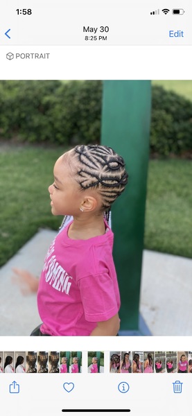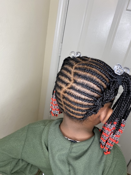 Cornrow braids uniquely designed for you. Size & Designs can vary from butterflies, hearts, criss-cross and zig-zag braids into a straight back or side style. Extensions, Beads and Accessories available upon REQUEST. Pricing vary between toddlers
