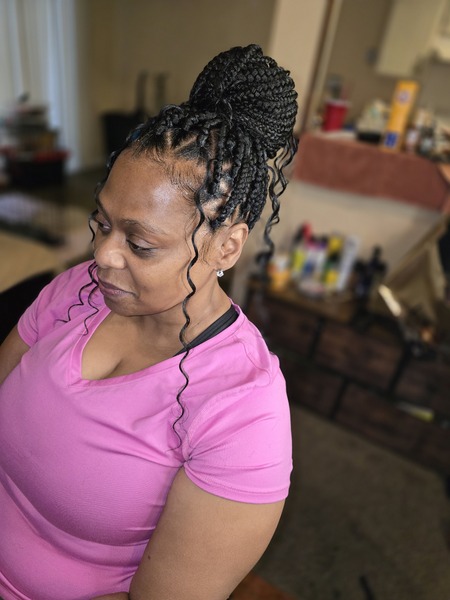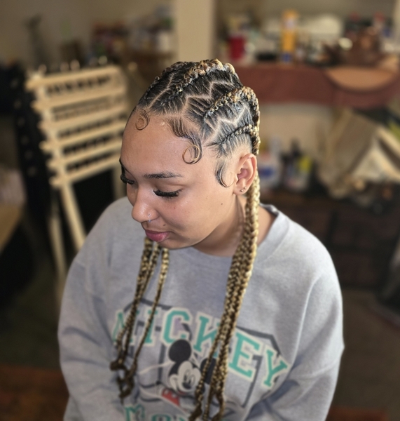 Creative braided styles (10-12 braids)styles vary from $50-$75 NO WEAVE ADDEDHair added prices will vary and will be quoted prior to service Accessories can be added just let me know what to buy and colors and will quote with hair price