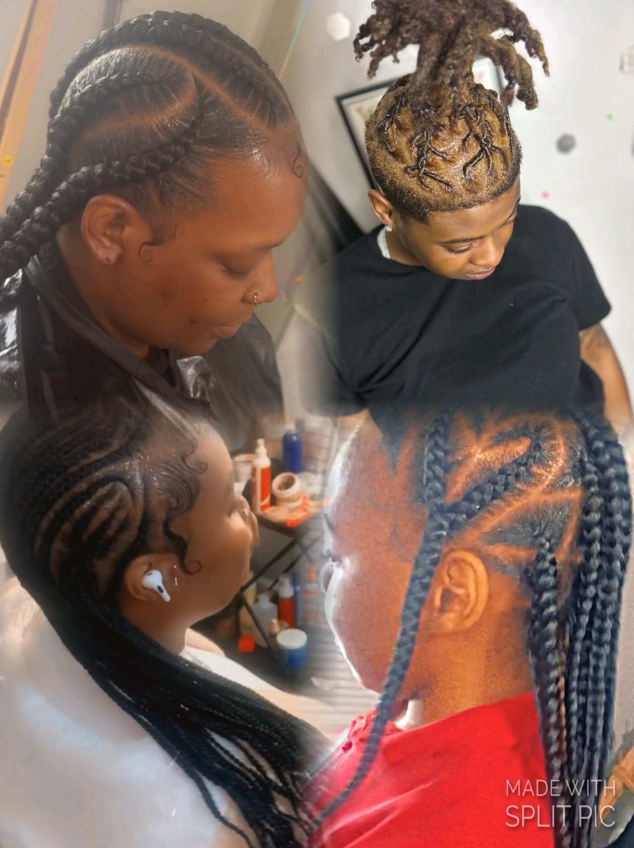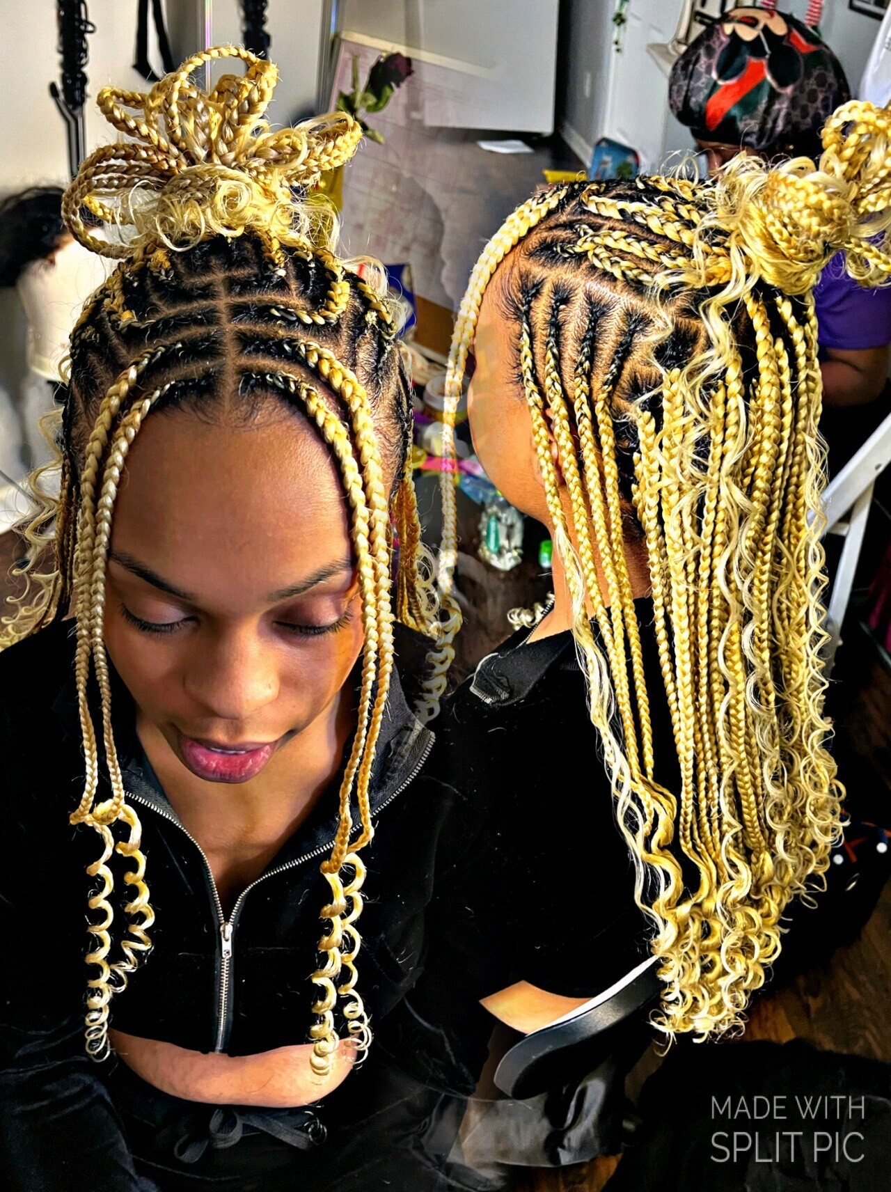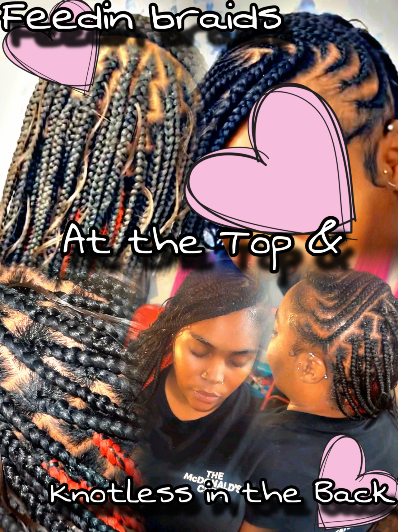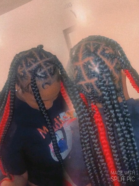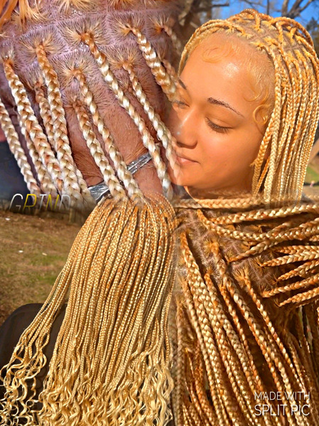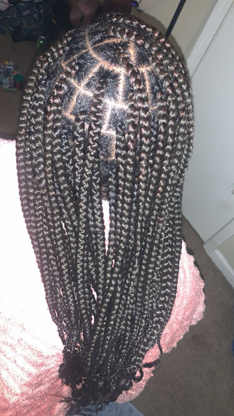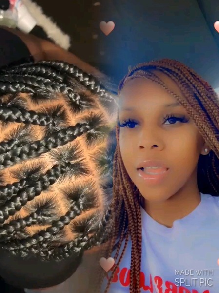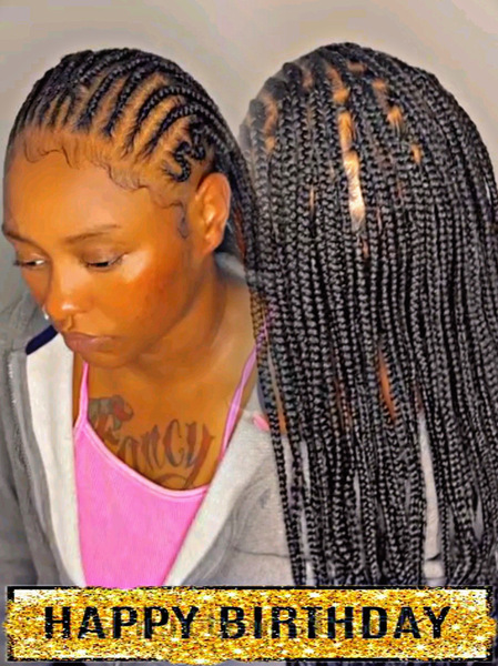 Knotless braids are in the back and the top is lemonade braids , please send me the design you would like 2 days before your appointment. So that your braiding hair is already out when you arrive to your appointment, they are wrist length but if you