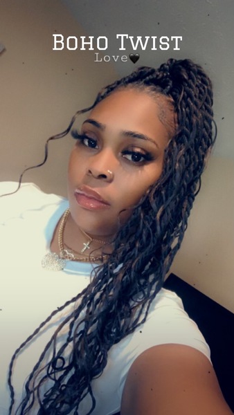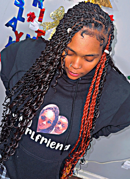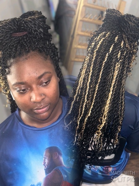 A twist that starts off as a knotless just a little then you start with the two strand twist until the end, you can curl the ends or keep the straight. I provide the ha