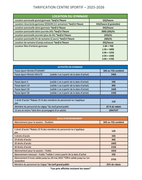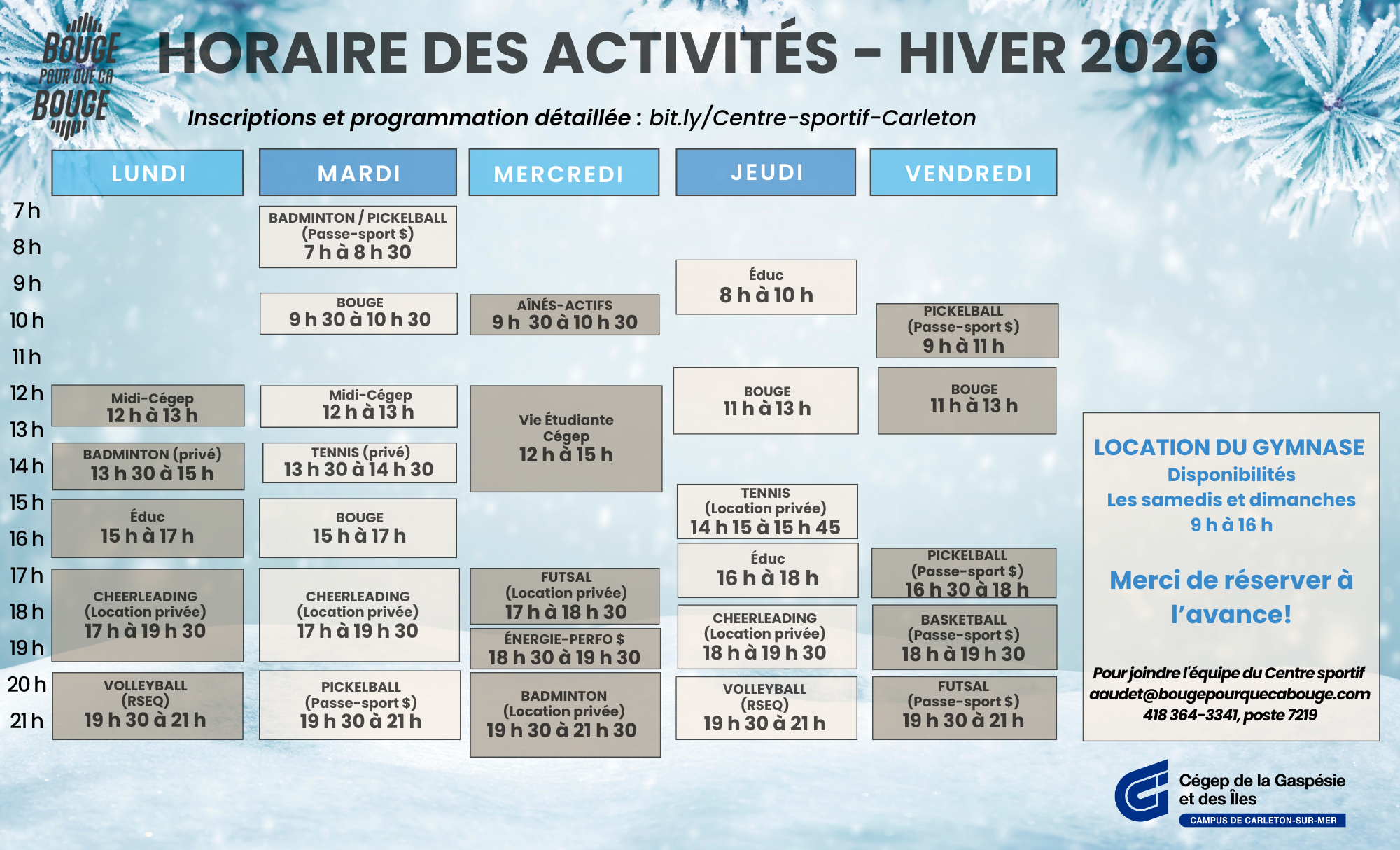 Mardi 7h00-8h30Les joueurs doivent laisser leurs chaussures à l'entrée et utiliser des souliers de gymnase pour la pratique de leur sport.Les personnes admises au gymnase sont celles s'étant acquittées de leurs droits de jeu. Celui-ci sera contrôlé à