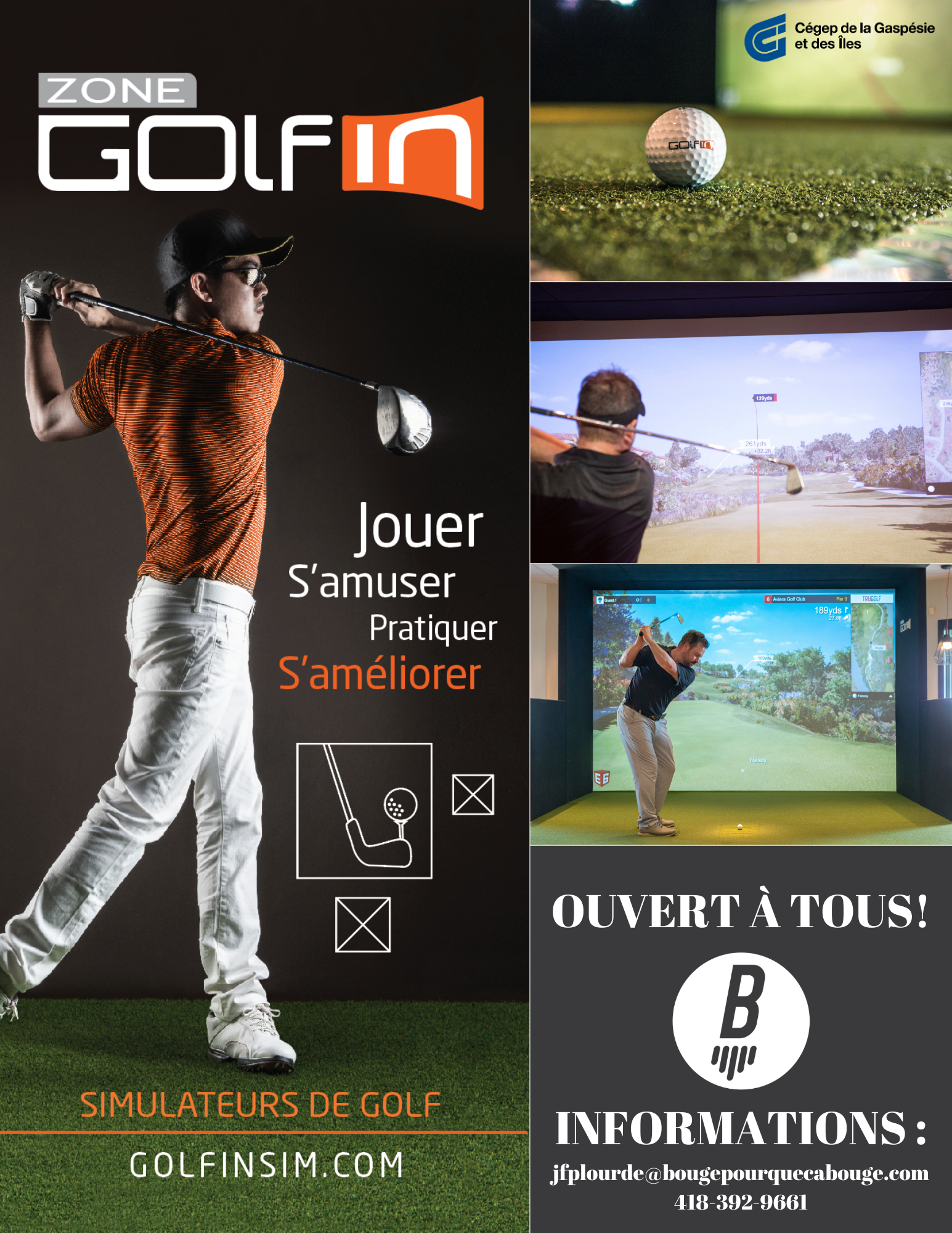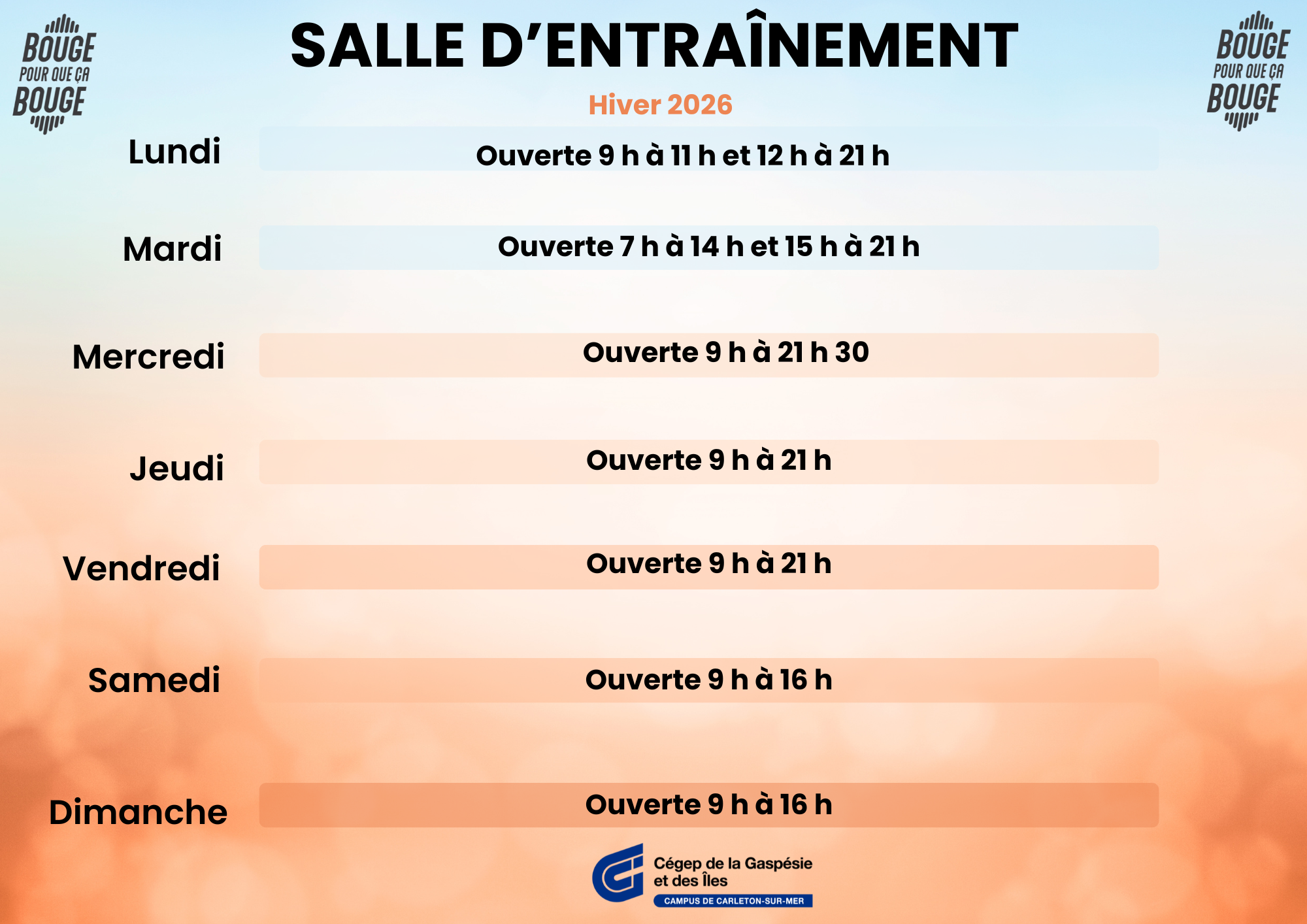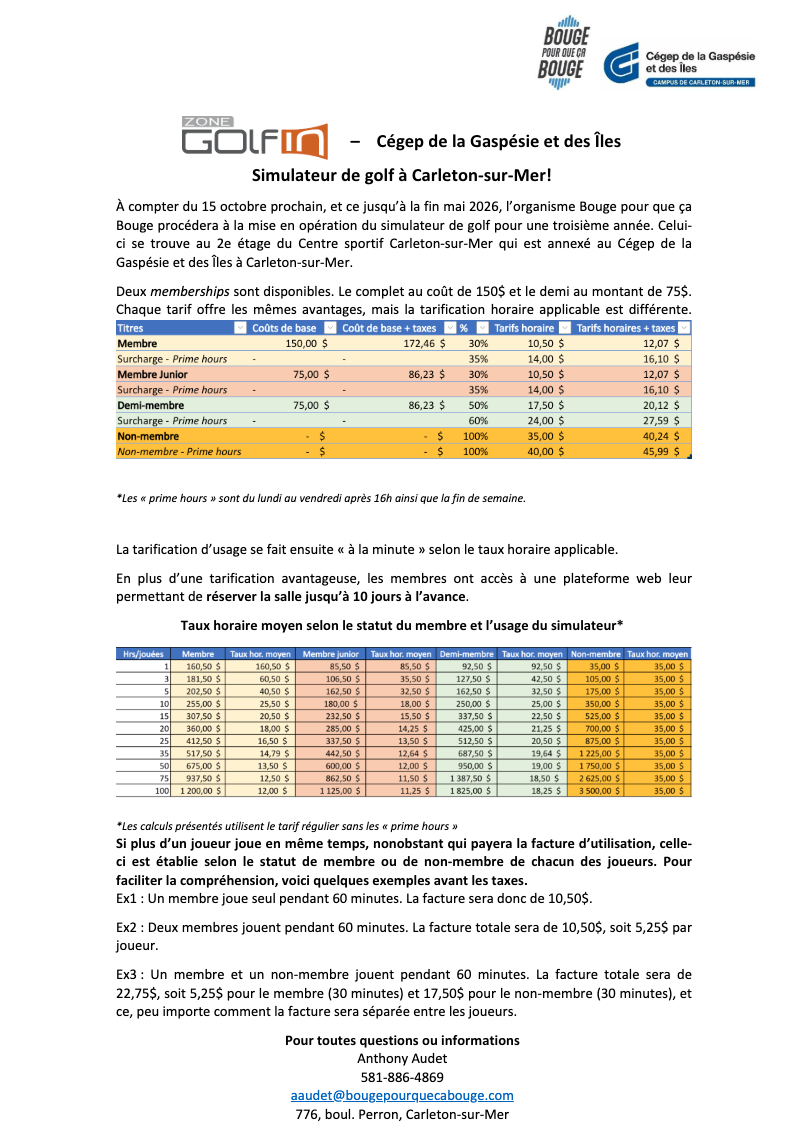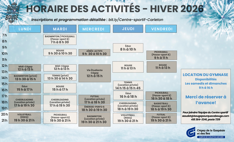 Nous avons comme mission d'inciter les étudiantes, les étudiants et la population de la Baie-des-Chaleurs à adopter un mode de vie sain et actif.Des questions ? Appelez-vous au 418 364-3341, poste 7219, ou contactez-nous par courriel à aaudet@bougepourquecabouge.com.Galeria