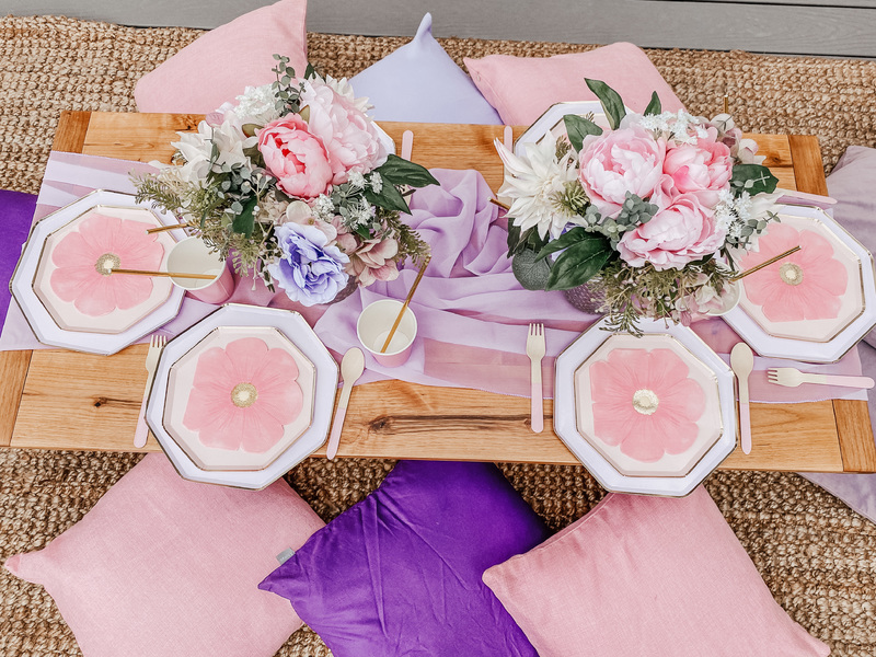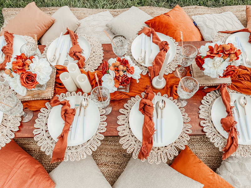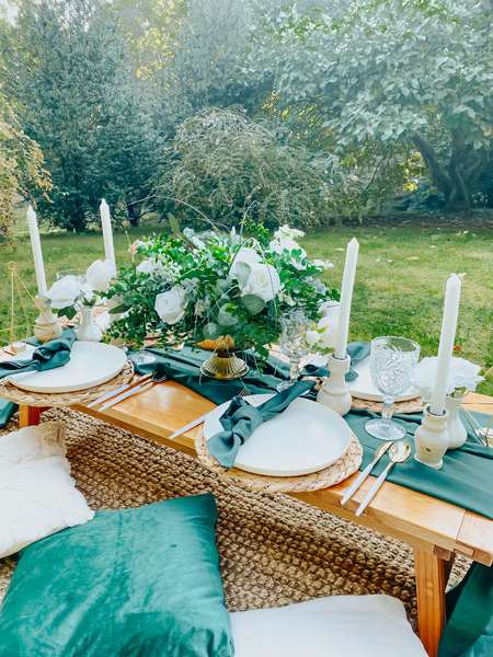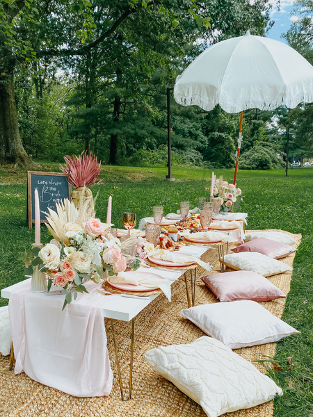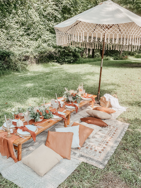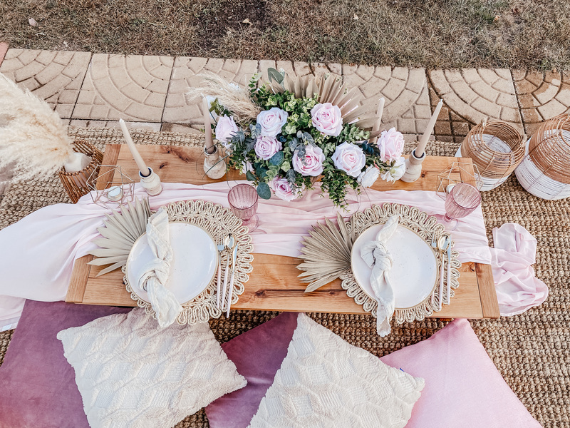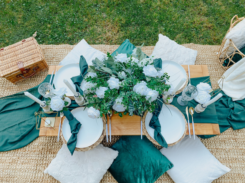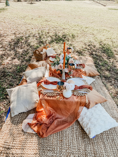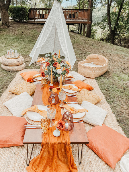 This includes custom handmade picnic table(s), table runners, woven floor rugs, an assortment of colored floor cushions, centerpieces, candle sticks holders, candles, plates, napkins, silverware, goblets, and a picnic blanket. Your picnic will