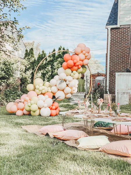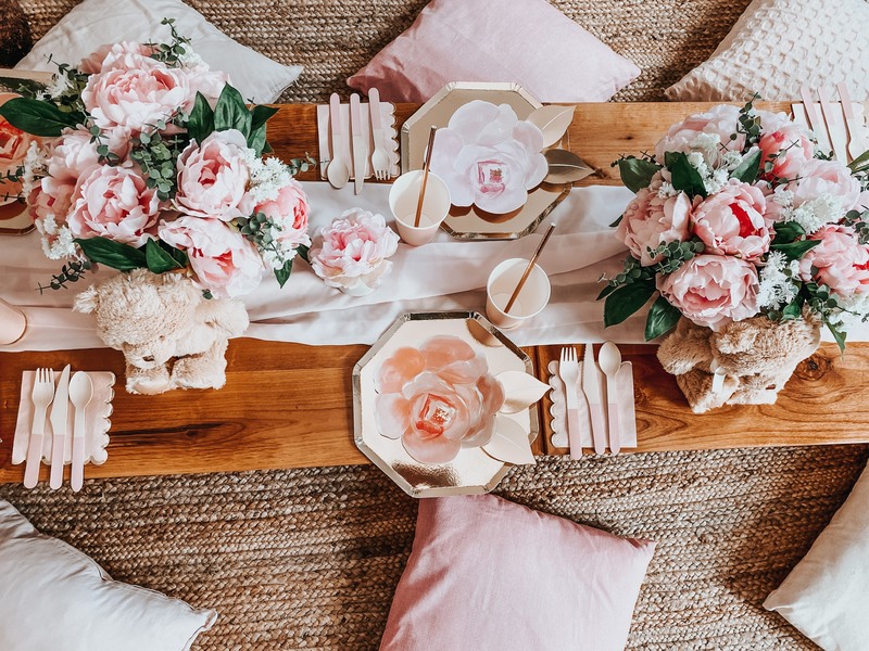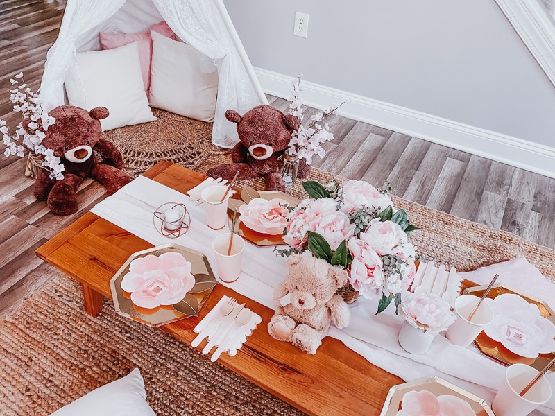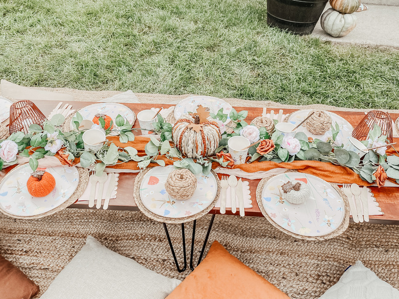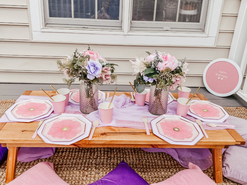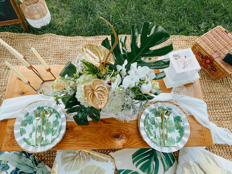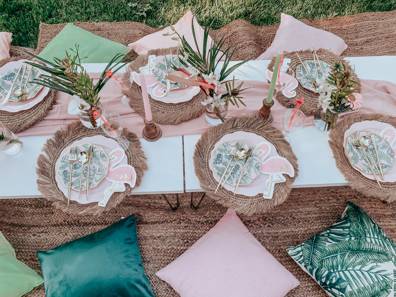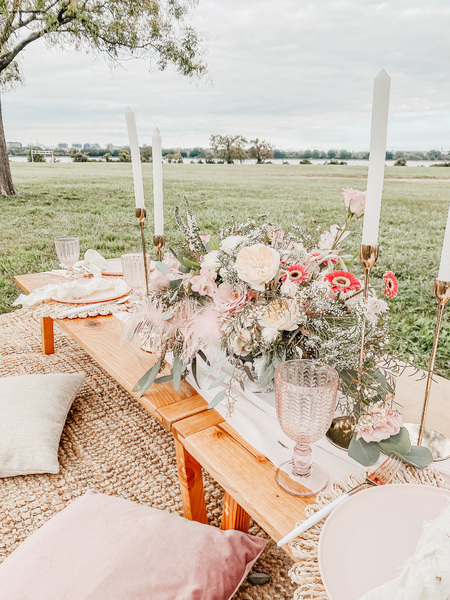 This includes custom handmade picnic table(s), table runners, woven floor rugs, an assortment of colored floor cushions, centerpieces, candle sticks holders, candles, plates, napkins, silverware, goblets, and a picnic blanket. Your picnic will
