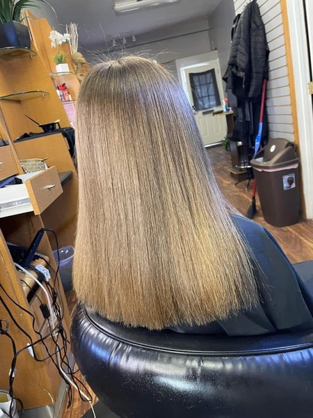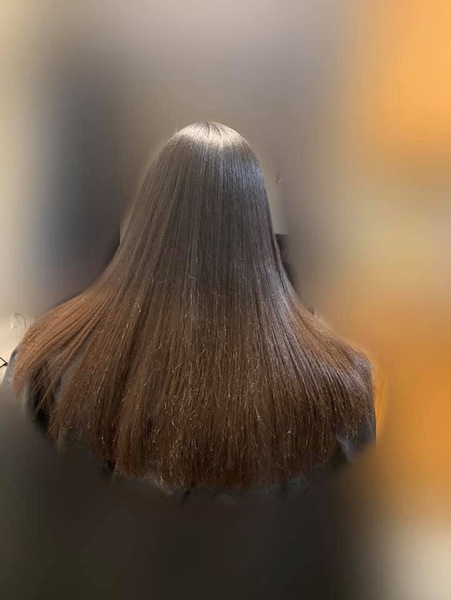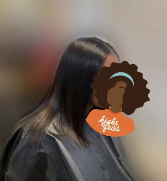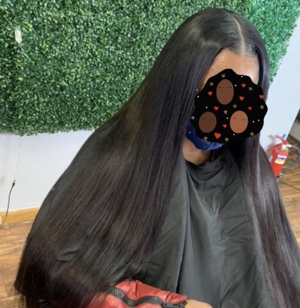 Hair is washed deep conditioned and given a silkening treatment before being flat ironed and styled.