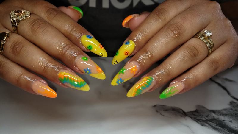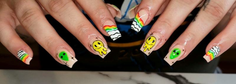 Acrylic overlay includes natural nail preparation and cuticle trim followed by acrylic application and design.