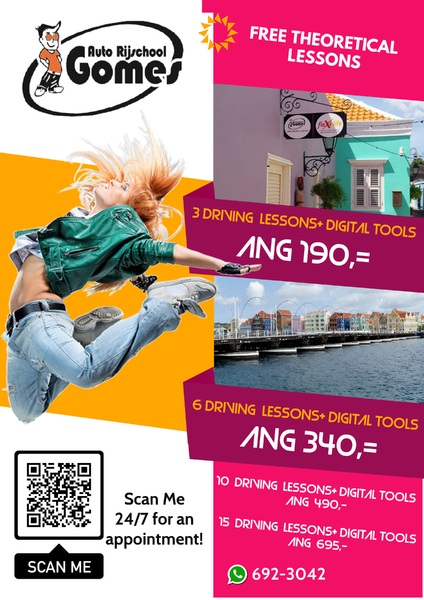 Auto Rijschool Gomes mas ku 42 aña di eksperenshá pa bo Siña stür Outo I Bromer!Un tim di Instruktornan eksperenshá pa yudabo yega na bo reibeweis.(e servisio aki ta pa lès di praktika di djaluna - djabièrnè di 8:00AM -5:0