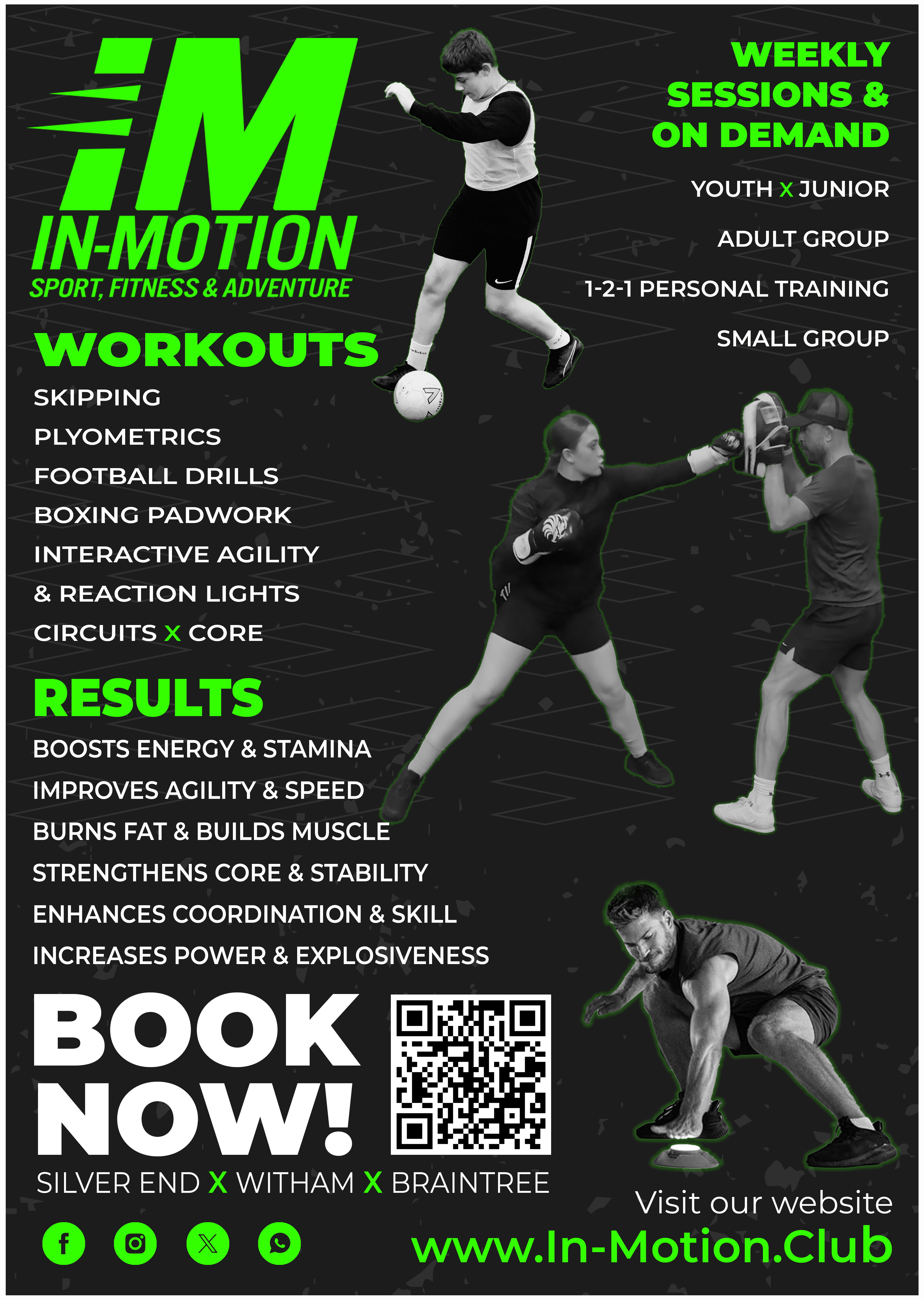 In Motion - Sports, Fitness & AdventureAt In-Motion, we don’t just exercise — we build strength, confidence, and community. Whether you’re looking to improve your running, build muscle, or simply push past your limits, our sessions are designed to empower you every step of the way. Led by a dedicated coach with professional qualifications in Sports & Exercise Science, Sports Leadership, and Fitness Instruction, every session combines expert guidance, dynamic workouts, and personalised support to help you achieve your goals — and enjoy the journey. From high-energy group classes to bespoke one-to-one coaching, we create a safe, supportive environment where you’ll feel motivated, challenged, and inspired. This isn’t just about fitness — it’s about becoming the strongest version of yourself, both physically and mentally. Join us at In-Motion and discover what you’re truly capable of. Your journey starts here — let’s move forward together.Planning something unforgettable? Our events support turns ideas into seamless celebrations—birthdays, corporate gatherings, community activations, and more—delivered with creative flair and dependable coordination.Local, friendly, and professional, we prioritise clear communication, flexible scheduling, and results you can feel: de-stress, perform better, and make memories that last. Whether you’re elevating your wellness routine, levelling up your performance, or hosting a standout event, we make it effortless and enjoyable.Your best moments start here. Book with inmotionuk today and let us craft a made-for-you experience in Silver End and the surrounding area. Move. Glow. Celebrate.Galeria